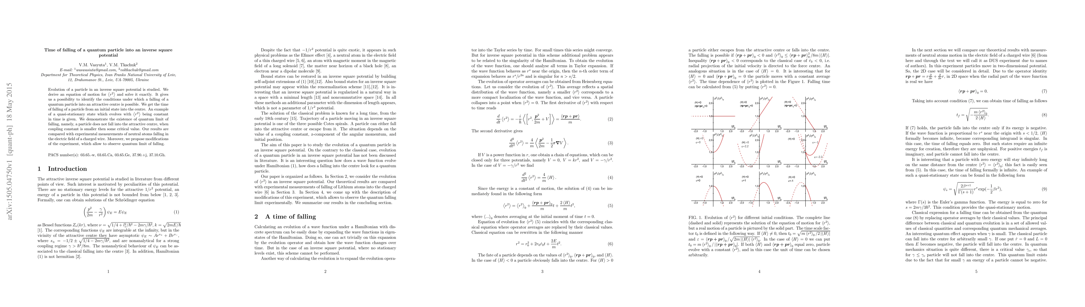 This paper studies the dynamics of a quantum particle under an inverse square potential, deriving an exact equation of motion for $\left<r^2\right>$ and determining the conditions for the particle's fall into an attractive center. It identifies a quantum limit where particles do not fall if the coupling constant is below a critical value, and suggests experimental modifications to observe this phenomenon.