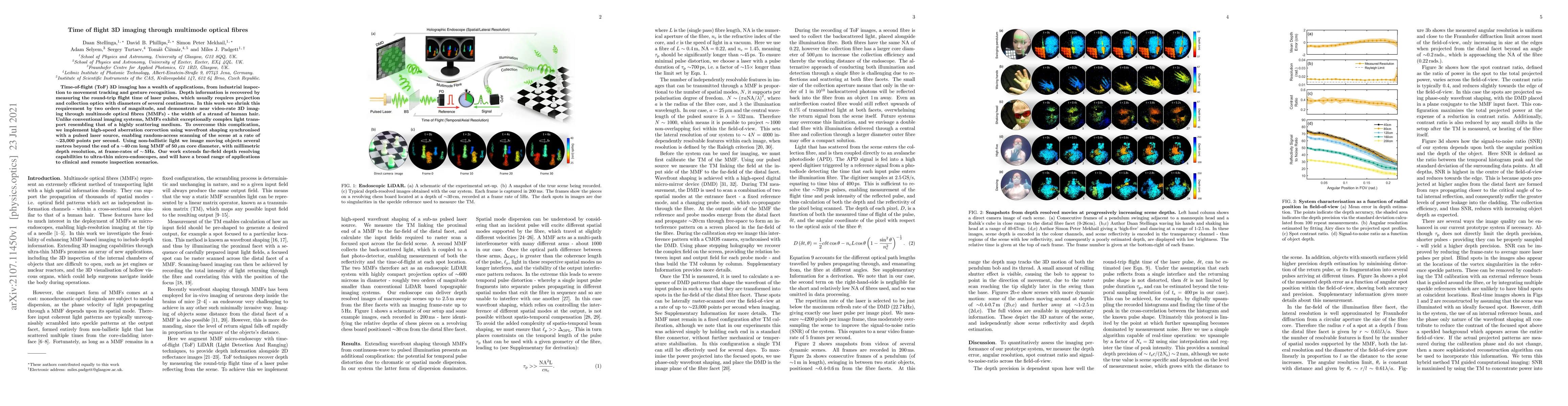 Time-of-flight (ToF) 3D imaging has a wealth of applications, from industrial inspection to movement tracking and gesture recognition. Depth information is recovered by measuring the round-trip flight time of laser pulses, which usually requires projection and collection optics with diameters of several centimetres. In this work we shrink this requirement by two orders of magnitude, and demonstrate near video-rate 3D imaging through multimode optical fibres (MMFs) - the width of a strand of human hair. Unlike conventional imaging systems, MMFs exhibit exceptionally complex light transport resembling that of a highly scattering medium. To overcome this complication, we implement high-speed aberration correction using wavefront shaping synchronised with a pulsed laser source, enabling random-access scanning of the scene at a rate of $\sim$23,000 points per second. Using non-ballistic light we image moving objects several metres beyond the end of a $\sim$40 cm long MMF of 50$\mu$m core diameter, with millimetric depth resolution, at frame-rates of $\sim$5Hz. Our work extends far-field depth resolving capabilities to ultra-thin micro-endoscopes, and will have a broad range of applications to clinical and remote inspection scenarios.