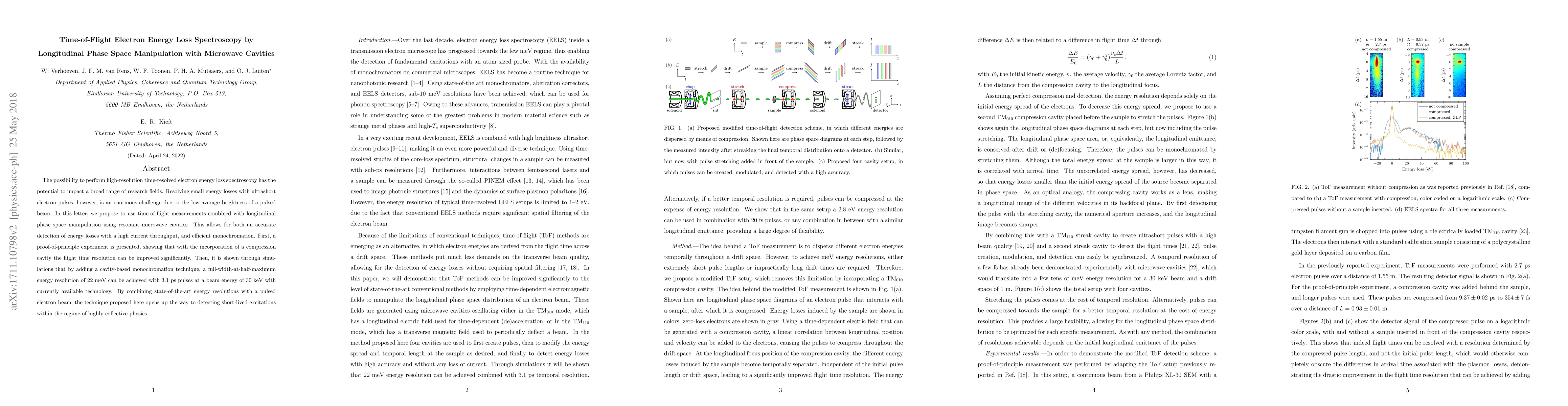 The paper introduces a novel method using microwave cavities for longitudinal phase space manipulation in ToF electron energy loss spectroscopy, improving energy and temporal resolutions.