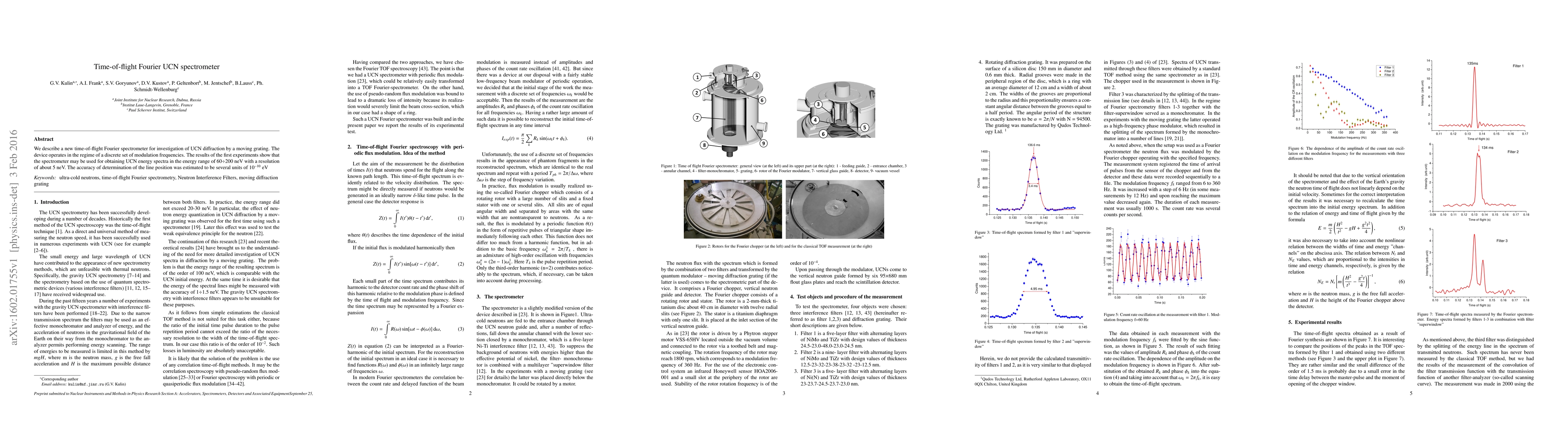 The paper presents a new time-of-flight Fourier spectrometer for studying UCN diffraction, achieving UCN energy spectra in the range of 60–200 neV with a resolution of 5 neV and an accuracy of several units of $10^{-10}$ eV. Initial experiments demonstrate its potential for precise UCN energy measurements.