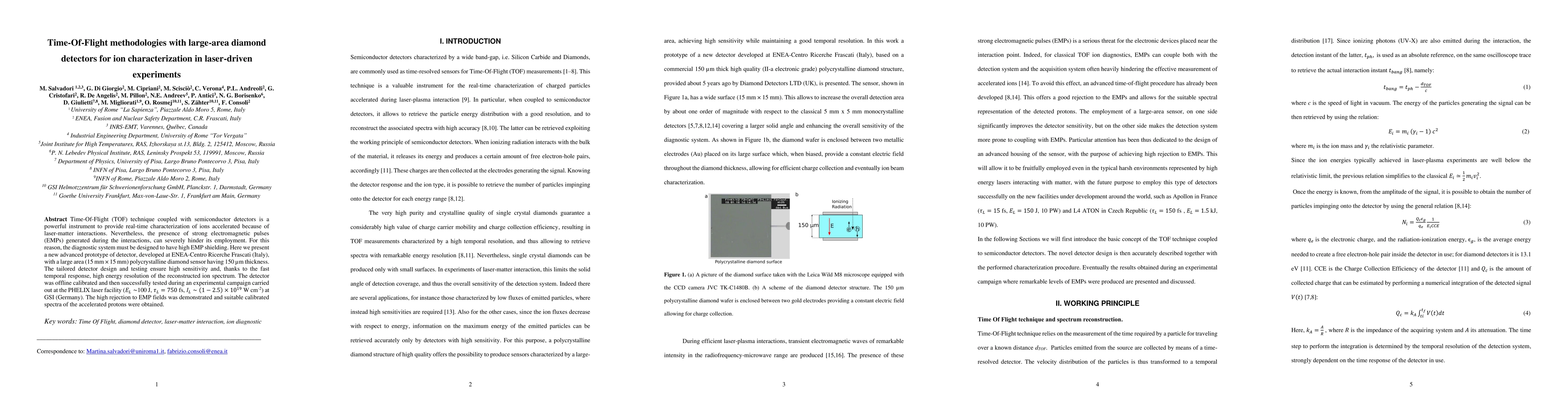 Time-Of-Flight (TOF) technique coupled with semiconductor detectors is a powerful instrument to provide real-time characterization of ions accelerated because of laser-matter interactions. Nevertheless, the presence of strong electromagnetic pulses (EMPs) generated during the interactions, can severely hinder its employment. For this reason, the diagnostic system must be designed to have high EMP shielding. Here we present a new advanced prototype of detector, developed at ENEA-Centro Ricerche Frascati (Italy), with a large area (15 mm x 15 mm) polycrystalline diamond sensor having 150 microns thickness. The tailored detector design and testing ensure high sensitivity and, thanks to the fast temporal response, high energy resolution of the reconstructed ion spectrum. The detector was offline calibrated and then successfully tested during an experimental campaign carried out at the PHELIX laser facility at GSI (Germany). The high rejection to EMP fields was demonstrated and suitable calibrated spectra of the accelerated protons were obtained.