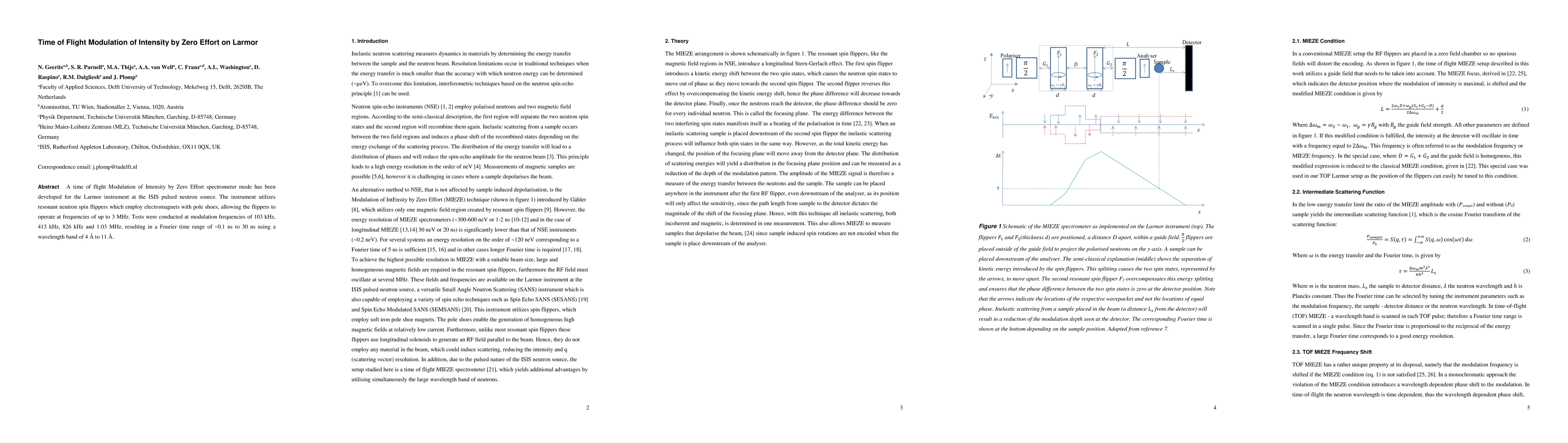The MIEZE spectrometer mode for the Larmor instrument at ISIS uses resonant neutron spin flippers to achieve modulation frequencies up to 3 MHz, allowing for time ranges from ~0.1 ns to 30 ns with a wavelength band of 4 Å-11 Å.