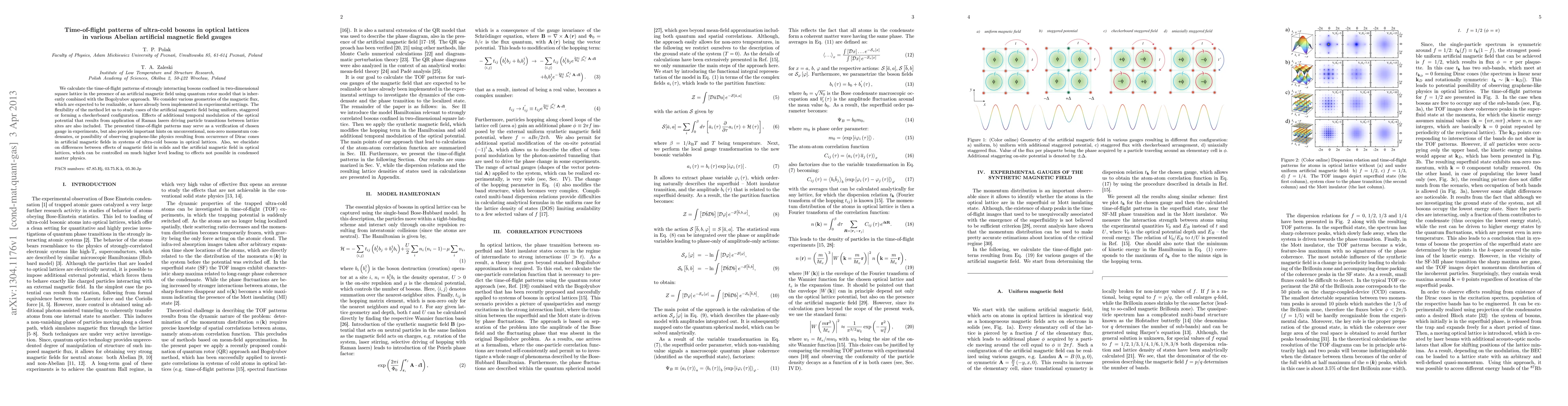 This paper investigates the time-of-flight patterns of ultra-cold bosons in optical lattices under various Abelian artificial magnetic field gauges using a quantum rotor model. It explores different magnetic flux geometries and the effects of Raman lasers, providing insights into unconventional condensates and graphene-like physics.