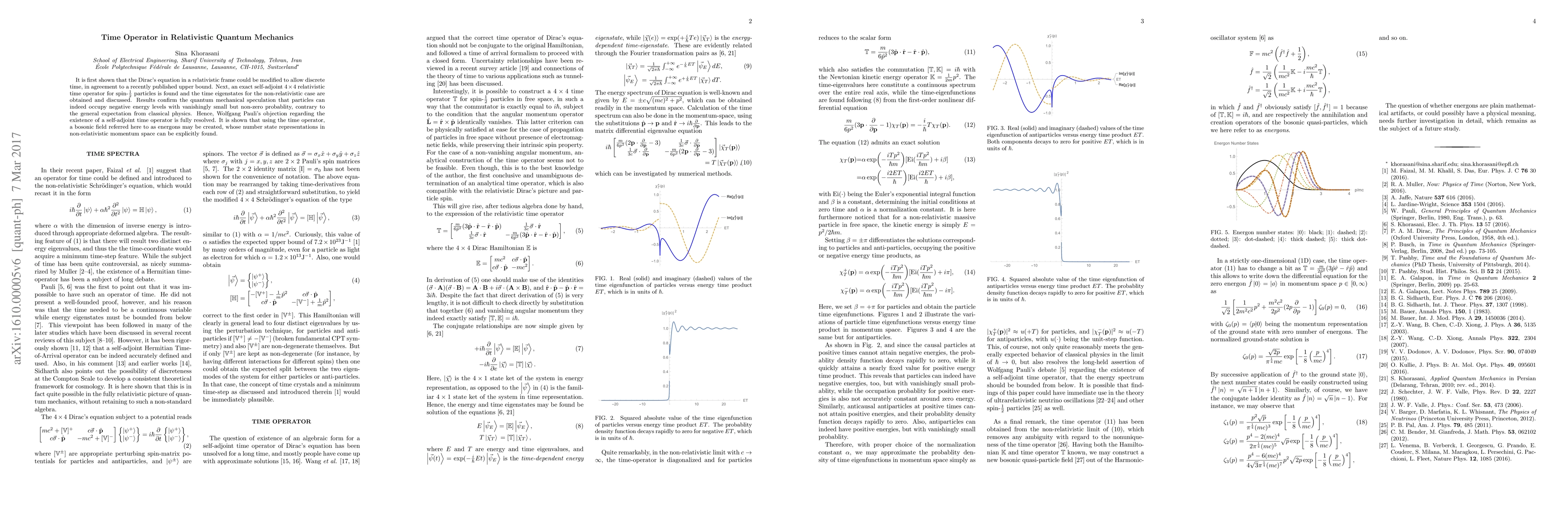 This paper modifies Dirac's equation to accommodate discrete time and introduces a self-adjoint time operator for spin-½ particles, resolving Pauli's objection. It also demonstrates the creation of a bosonic field called energons using this operator, confirming the existence of particles in negative energy states.