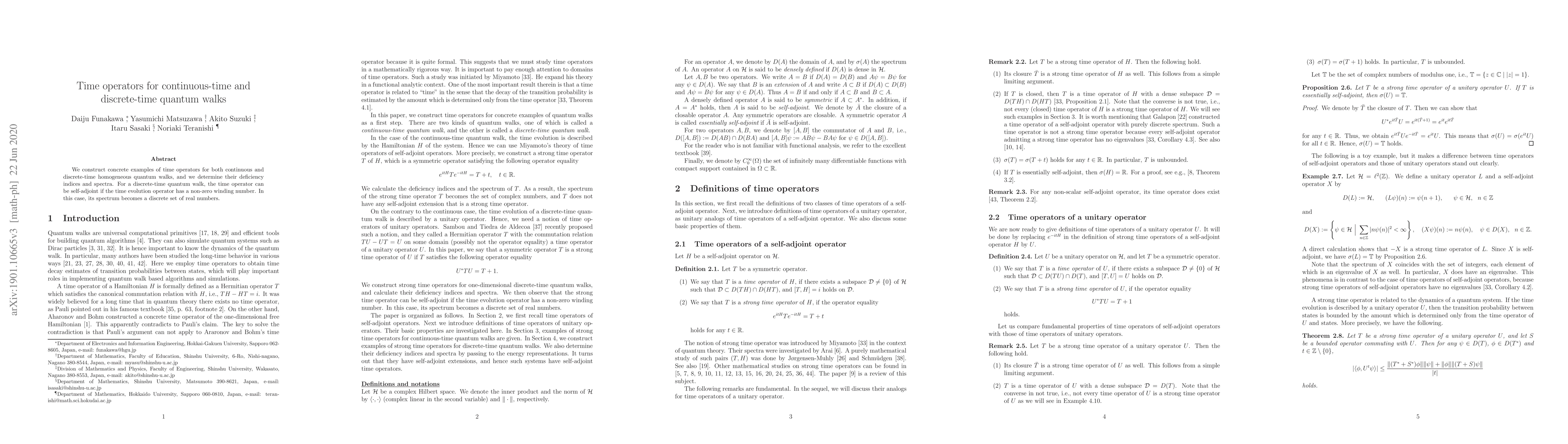 Summary: This paper constructs time operators for both continuous and discrete-time quantum walks, determining their deficiency indices and spectra. For discrete-time walks with a non-zero winding number, the time operator can be self-adjoint, resulting in a discrete spectrum of real numbers.