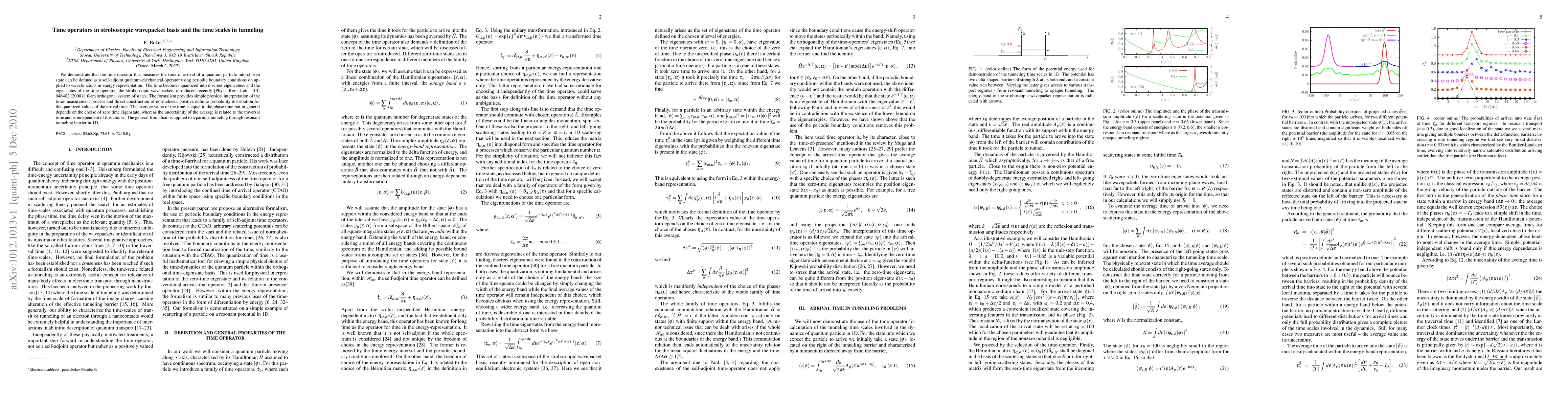 We demonstrate that the time operator that measures the time of arrival of a quantum particle into chosen state can be defined as a self-adjoint quantum-mechanical operator using periodic boundary conditions on applied to wavefuncions in energy representation. The time becomes quantized into discreet eigenvalues and the eigenstates of the time operator, the stroboscopic wavepackets introduced recently [Phys. Rev. Lett. 101, 046402 (2008).] form orthogonal system of states. The formalism provides simple physical interpretation of the time-measurement process and direct construction of normalized, positive definite probability distribution for the quantized values of the arrival time. The average value of the time is equal to the phase time but in general depends on the choise of zero time eigenstate, whereas the uncertainity of the average is related to the traversal time and is independent of this choise. The general fromalism is applied to a particle tunneling through resonant tunneling barrier in 1D.