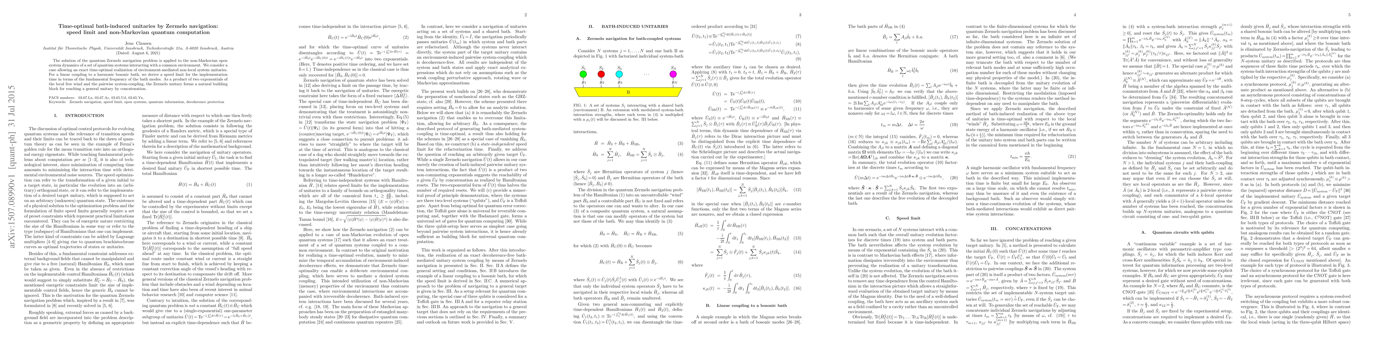 The solution of the quantum Zermelo navigation problem is applied to the non-Markovian open system dynamics of a set of quantum systems interacting with a common environment. We consider a case allowing an exact time-optimal realization of environment-mediated non-local system unitaries. For a linear coupling to a harmonic bosonic bath, we derive a speed limit for the implementation time in terms of the fundamental frequency of the bath modes. As a product of two exponentials of the local free wind and the pairwise system-coupling, the Zermelo unitary forms a natural building block for reaching a general unitary by concatenation.