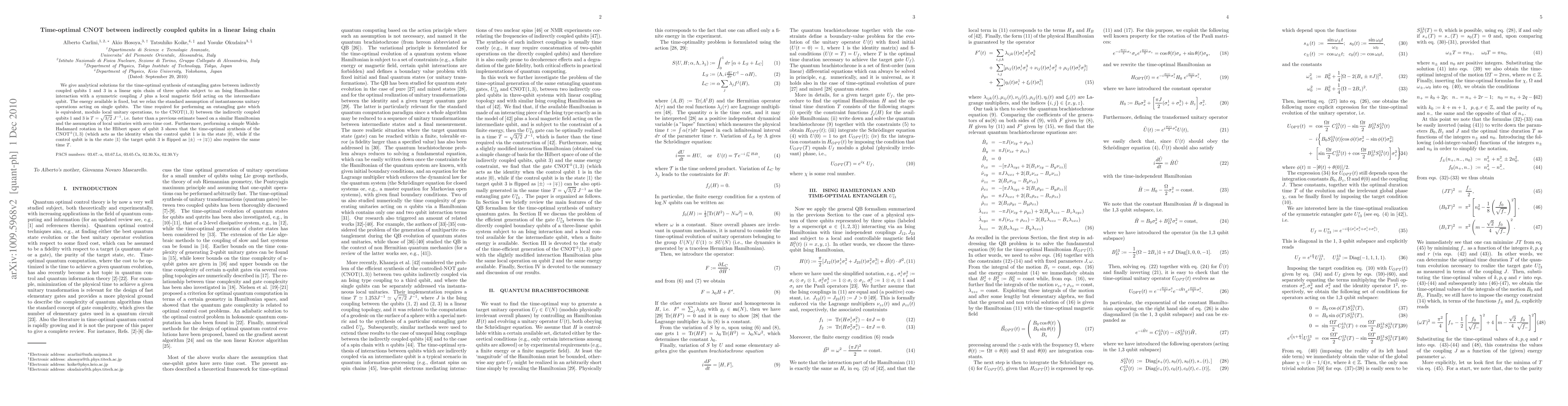 This paper presents analytical solutions for the time-optimal entangling gate between indirectly coupled qubits 1 and 3 in a linear Ising chain, achieving a faster time $T=\sqrt{3/2} J^{-1}$ than previous estimates, by relaxing the assumption of instantaneous local unitary operations. The time-optimal CNOT gate and its variants also require the same time $T$.