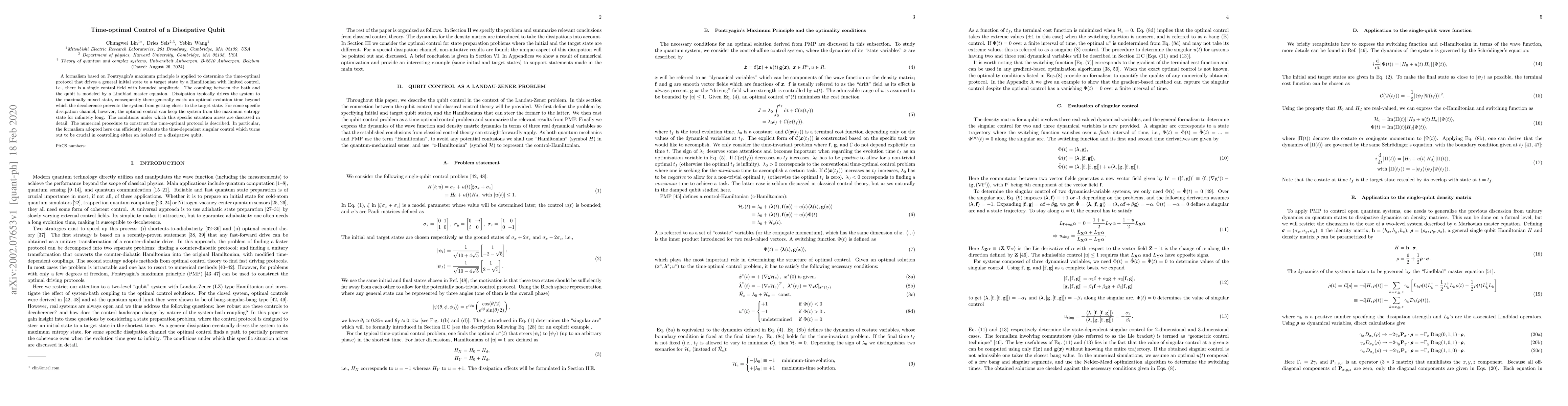 A formalism based on Pontryagin's maximum principle is applied to determine the time-optimal protocol that drives a general initial state to a target state by a Hamiltonian with limited control, i.e., there is a single control field with bounded amplitude. The coupling between the bath and the qubit is modeled by a Lindblad master equation. Dissipation typically drives the system to the maximally mixed state; consequently, there generally exists an optimal evolution time beyond which the decoherence prevents the system from getting closer to the target state. For some specific dissipation channel, however, the optimal control can keep the system from the maximum entropy state for infinitely long. The conditions under which this specific situation arises are discussed in detail. The numerical procedure to construct the time-optimal protocol is described. In particular, the formalism adopted here can efficiently evaluate the time-dependent singular control which turns out to be crucial in controlling either an isolated or a dissipative qubit.