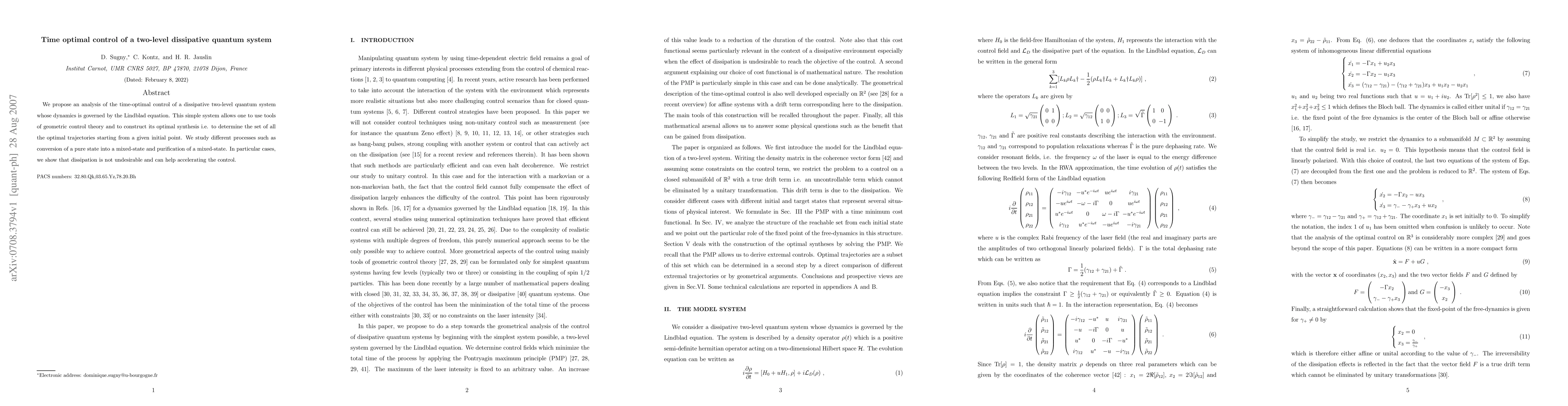 This paper proposes a time-optimal control analysis for a dissipative two-level quantum system governed by the Lindblad equation, utilizing geometric control theory to determine optimal trajectories. It demonstrates that dissipation can sometimes accelerate control processes, such as state conversion and purification.