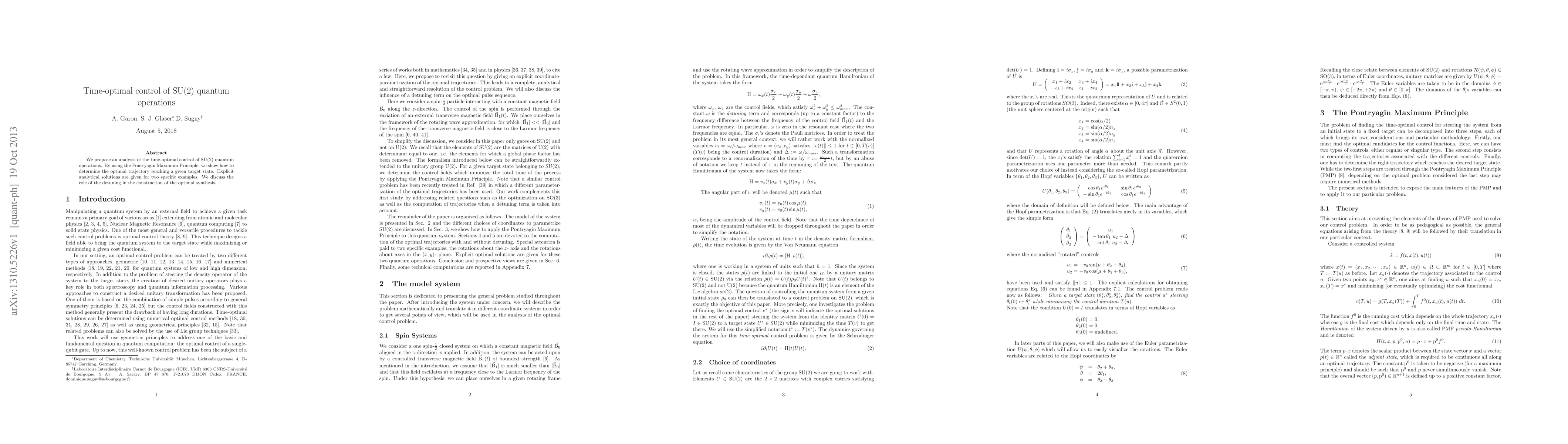 This paper analyzes time-optimal control for SU(2) quantum operations using the Pontryagin Maximum Principle, providing explicit analytical solutions for specific examples and discussing the impact of detuning on optimal control synthesis.