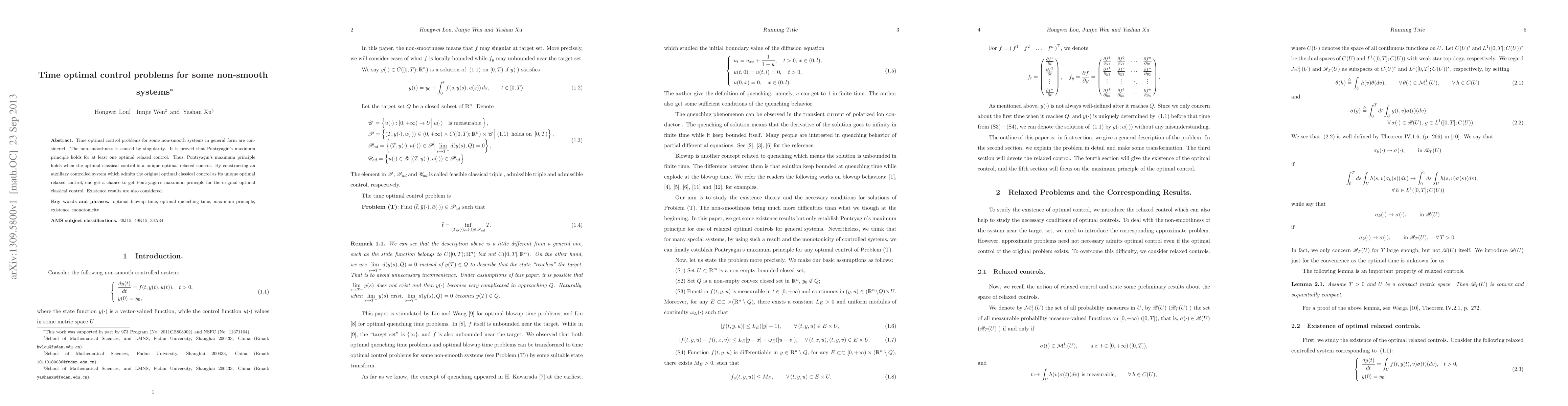 The paper considers time-optimal control problems for non-smooth systems, proving that Pontryagin's maximum principle holds for at least one optimal relaxed control. It establishes existence results and constructs an auxiliary controlled system to ensure the principle holds for the original optimal classical control.