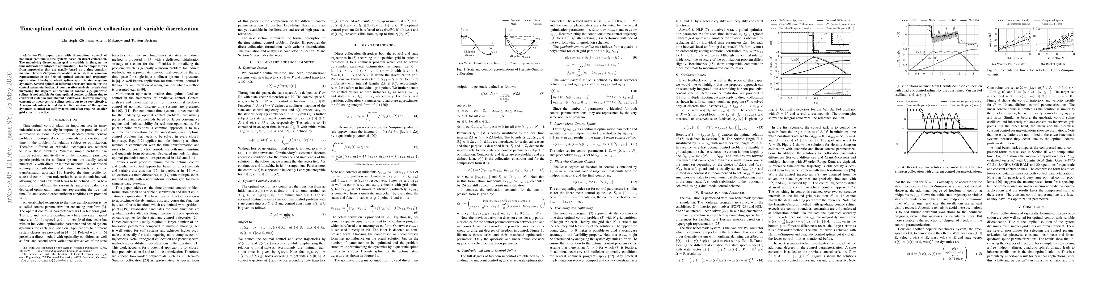 This paper proposes a time-optimal control method for nonlinear systems using direct collocation with variable discretization. It finds that constant or linear control splines are more effective than higher-order splines for time-optimal control, while benefiting from smaller grid sizes and suitability for stiff systems.