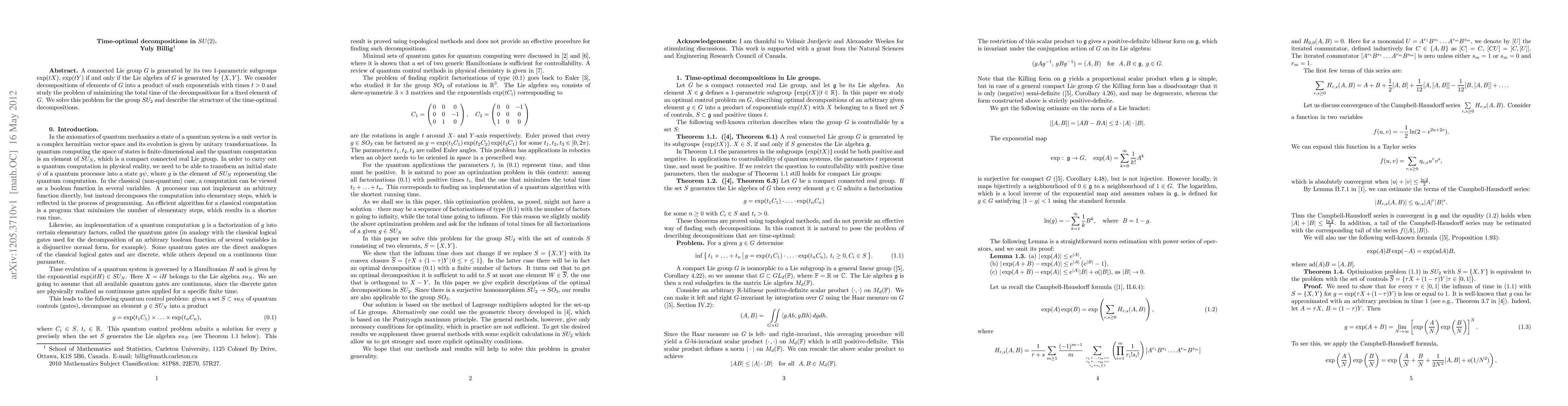 A connected Lie group G is generated by its two 1-parametric subgroups exp(tX), exp(tY) if and only if the Lie algebra of G is generated by {X, Y}. We consider decompositions of elements of G into a product of such exponentials with times t > 0 and study the problem of minimizing the total time of the decompositions for a fixed element of G. We solve this problem for the group SU(2) and describe the structure of the time-optimal decompositions.
