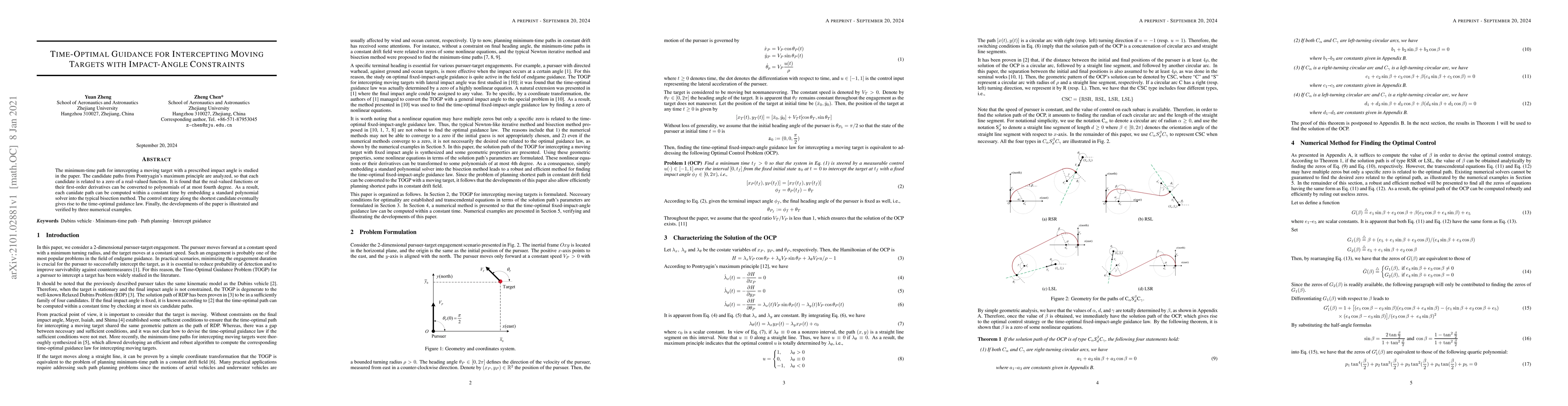 This paper develops a time-optimal guidance law for intercepting moving targets with prescribed impact angles, utilizing Pontryagin's maximum principle to analyze candidate paths. The real-valued functions derived are polynomial of at most fourth degree, enabling constant-time computation and verification through numerical examples.