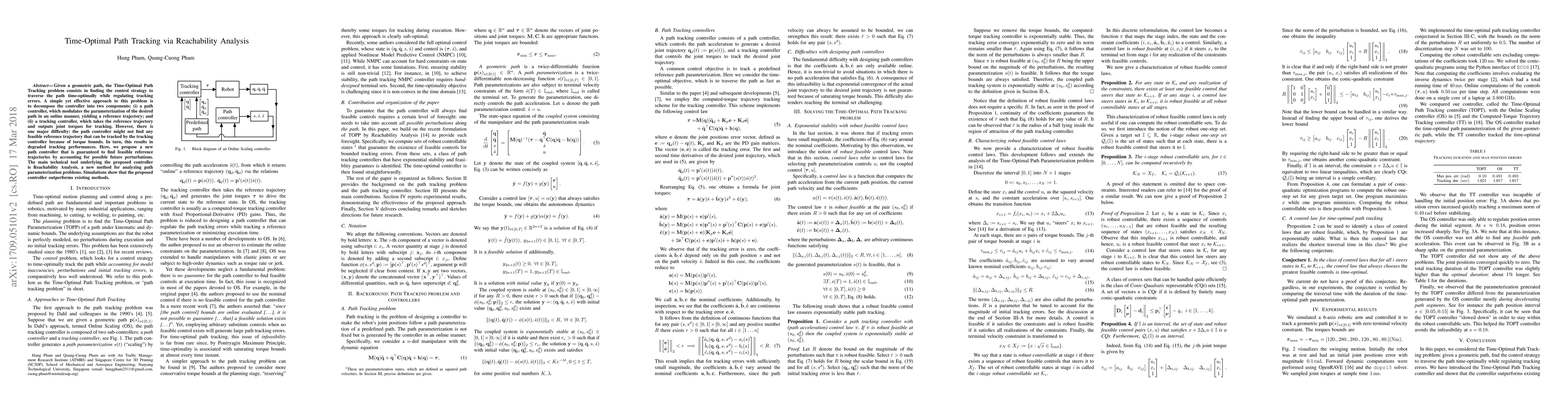 Given a geometric path, the Time-Optimal Path Tracking problem consists in finding the control strategy to traverse the path time-optimally while regulating tracking errors. A simple yet effective approach to this problem is to decompose the controller into two components: (i)~a path controller, which modulates the parameterization of the desired path in an online manner, yielding a reference trajectory; and (ii)~a tracking controller, which takes the reference trajectory and outputs joint torques for tracking. However, there is one major difficulty: the path controller might not find any feasible reference trajectory that can be tracked by the tracking controller because of torque bounds. In turn, this results in degraded tracking performances. Here, we propose a new path controller that is guaranteed to find feasible reference trajectories by accounting for possible future perturbations. The main technical tool underlying the proposed controller is Reachability Analysis, a new method for analyzing path parameterization problems. Simulations show that the proposed controller outperforms existing methods.