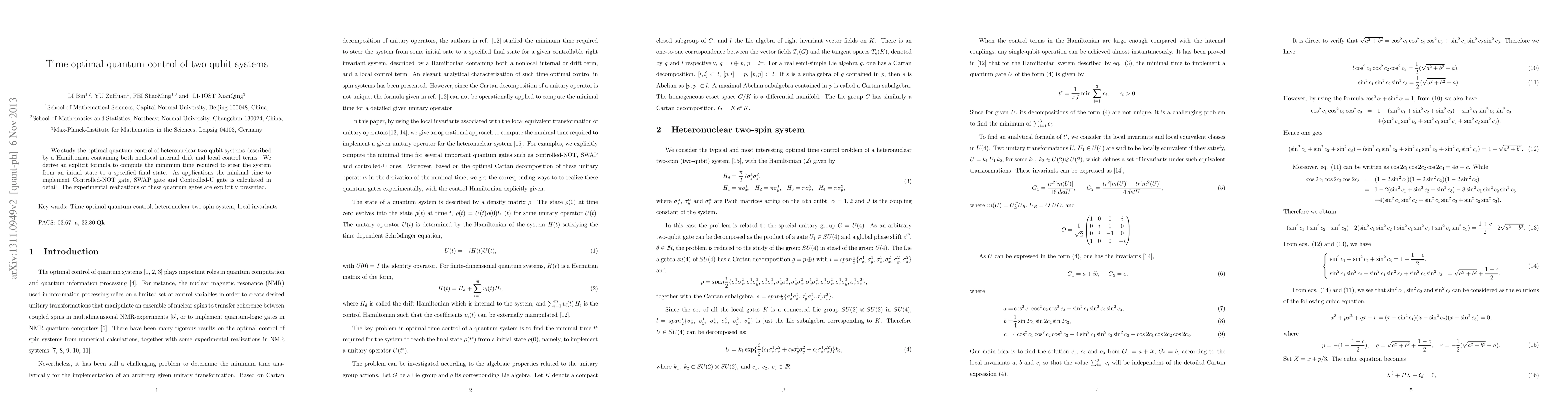 This paper derives an explicit formula for the minimum time to control heteronuclear two-qubit systems, applying it to implement Controlled-NOT, SWAP, and Controlled-U gates, and provides detailed experimental realizations for these quantum gates.
