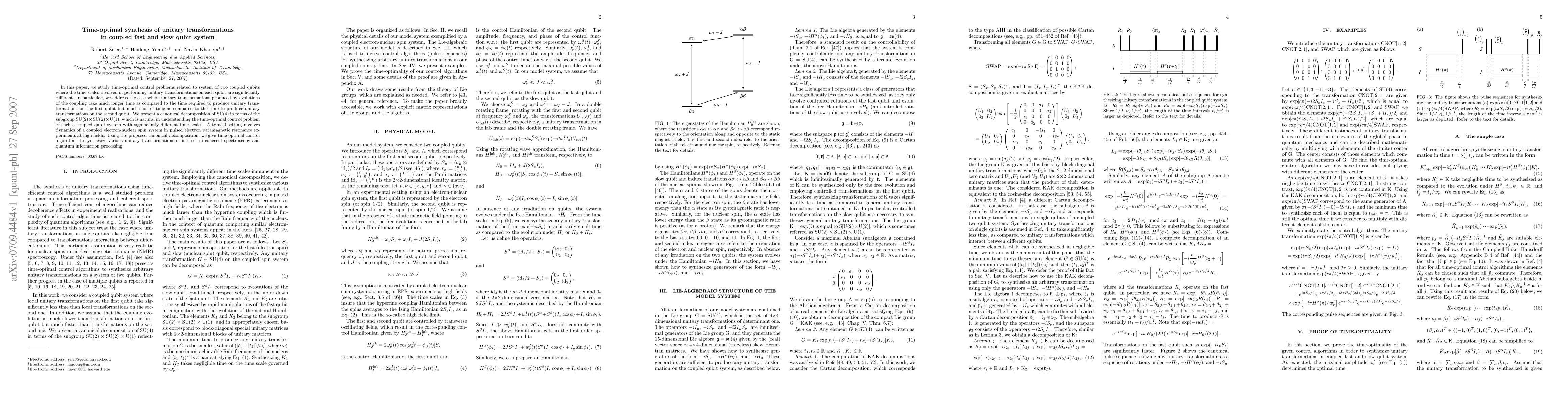 This paper investigates time-optimal control strategies for unitary transformations in a system of two coupled qubits with disparate time scales. It proposes a canonical decomposition of SU(4) to facilitate the understanding and control of such systems, providing algorithms for efficient unitary transformations in applications like coherent spectroscopy.