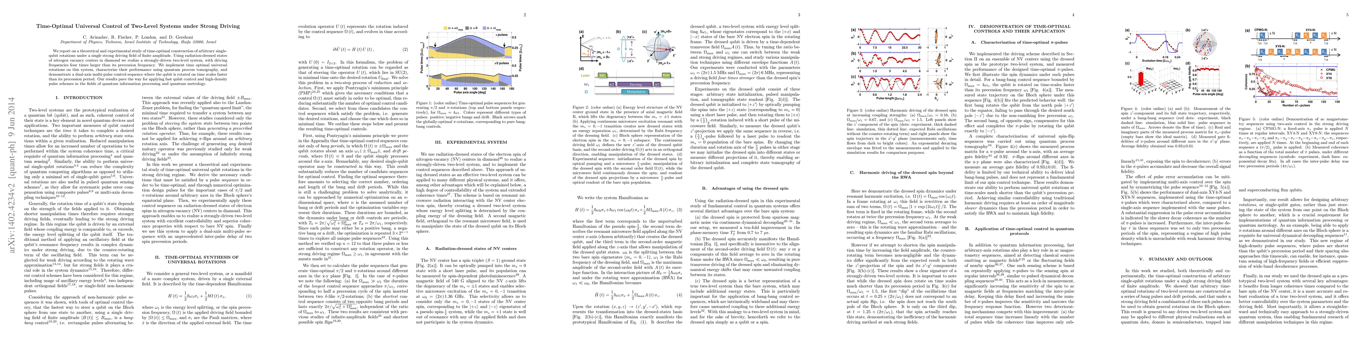 We experimentally study the time-optimal construction of arbitrary single-qubit rotations under a single strong driving field of finite amplitude. Using radiation-dressed states of nitrogen vacancy centers in diamond, we realize a strongly-driven two-level system and achieve driving frequencies four times larger than its Larmor frequency. We implement time optimal universal rotations on this system, characterize their performance using quantum process tomography, and demonstrate a dual-axis ac magnetometry sequence with pulses at sub-Larmor time scales. Our results pave the way for applying fast qubit control and high-density pulse schemes in the fields of quantum information processing and quantum metrology.