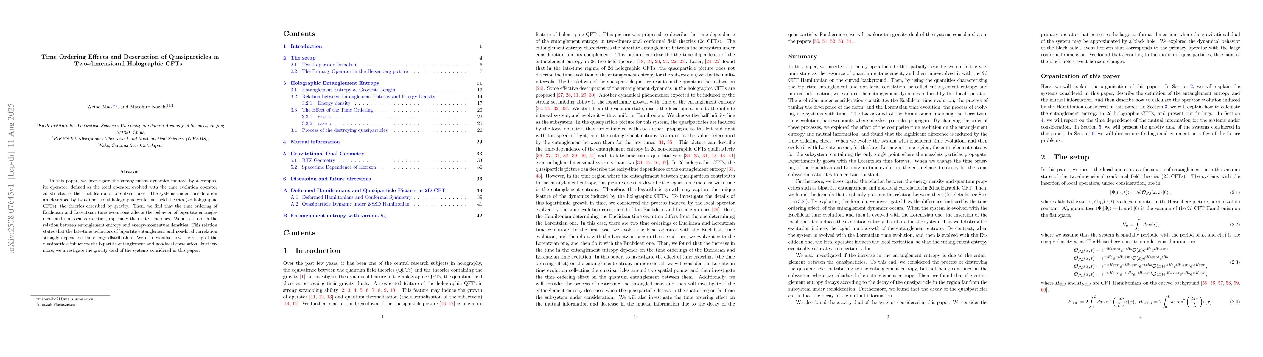 In this paper, we investigate the entanglement dynamics induced by a composite operator, defined as the local operator evolved with the time evolution operator constructed of the Euclidean and Lorentzian ones. The systems under consideration are described by two-dimensional holographic conformal field theories (2d holographic CFTs), the theories described by gravity. Then, we find that the time ordering of Euclidean and Lorentzian time evolutions affects the behavior of bipartite entanglement and non-local correlation, especially their late-time ones. We also establish the relation between entanglement entropy and energy-momentum densities. This relation states that the late-time behaviors of bipartite entanglement and non-local correlation strongly depend on the energy distribution. We also examine how the decay of the quasiparticle influences the bipartite entanglement and non-local correlation. Furthermore, we investigate the gravity dual of the systems considered in this paper.