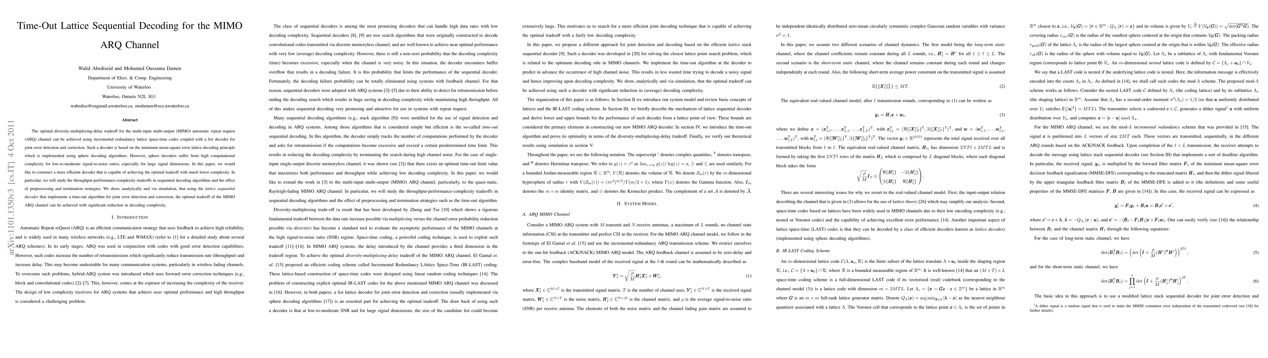 This paper proposes a time-out lattice sequential decoder for MIMO ARQ channels to achieve optimal diversity-multiplexing-delay tradeoff with reduced computational complexity compared to traditional sphere decoders. The study shows that this approach effectively balances throughput, performance, and complexity through strategic preprocessing and termination.