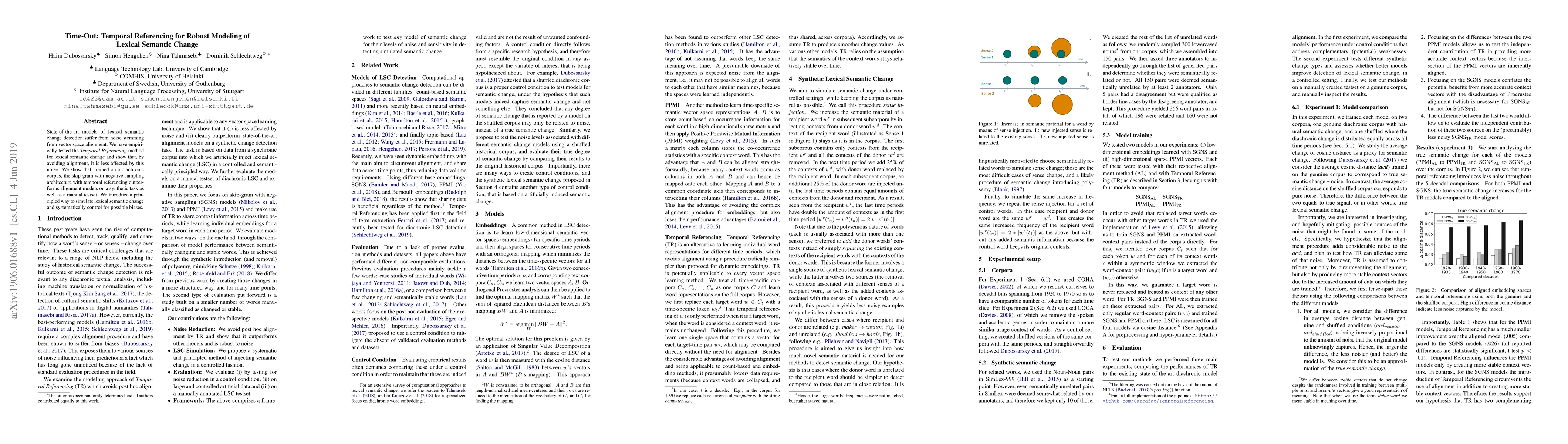 This paper proposes the Temporal Referencing method to detect lexical semantic change, demonstrating its effectiveness by showing it outperforms alignment-based models, which are prone to noise. The skip-gram model with temporal referencing, trained on a diachronic corpus, achieves better results on both synthetic and manual test sets.
