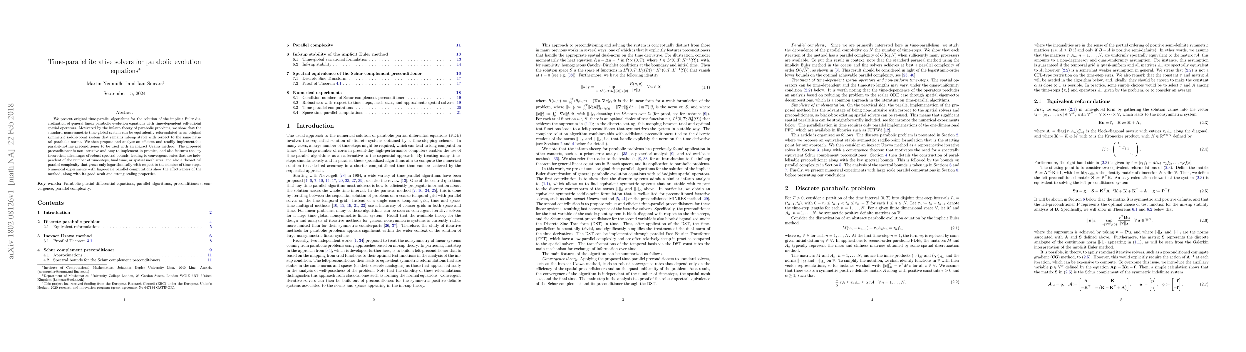This paper introduces time-parallel algorithms for solving parabolic evolution equations using an implicit Euler discretization. It presents a symmetric saddle-point system reformulation and proposes an efficient parallel-in-time preconditioner for an inexact Uzawa method, demonstrating robust spectral bounds and logarithmic parallel complexity growth.