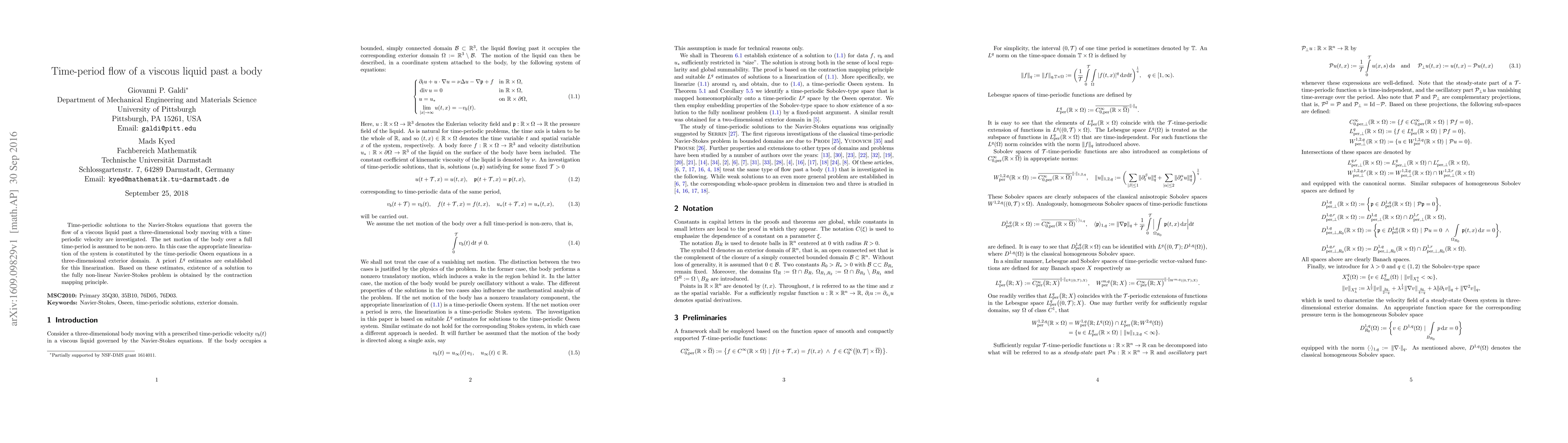 This paper investigates time-periodic solutions to the Navier-Stokes equations for a viscous liquid flowing past a three-dimensional body with a time-periodic velocity. It establishes a priori Lp estimates for the linearized Oseen equations and uses these to prove the existence of solutions to the full non-linear Navier-Stokes problem via the contraction mapping principle.