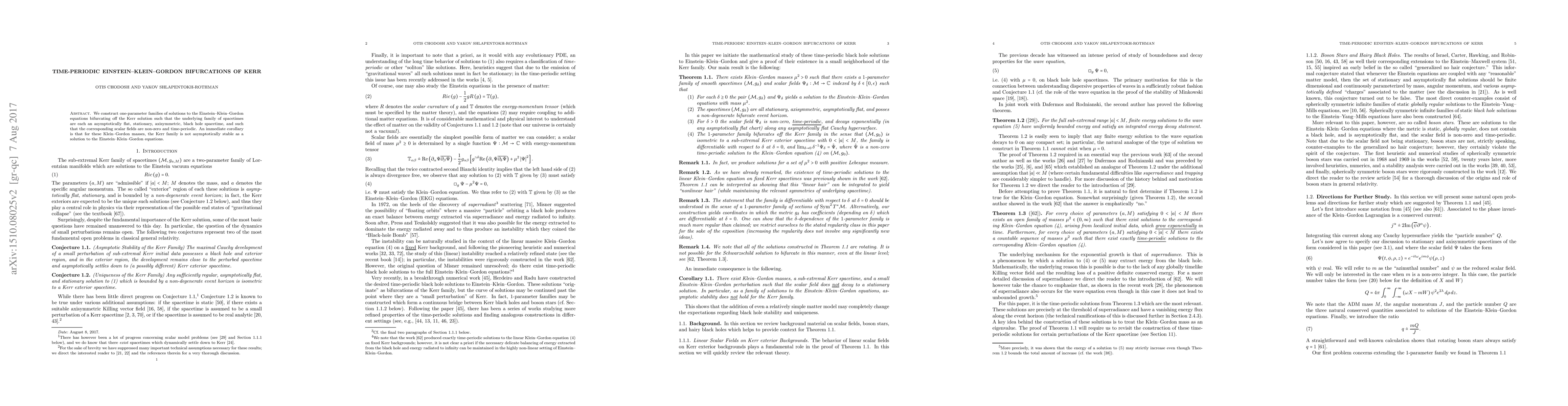 This paper constructs time-periodic solutions to the Einstein-Klein-Gordon equations that bifurcate from the Kerr black hole, demonstrating the scalar fields' non-zero and time-periodic nature. It concludes that the Kerr family is not asymptotically stable under these conditions.