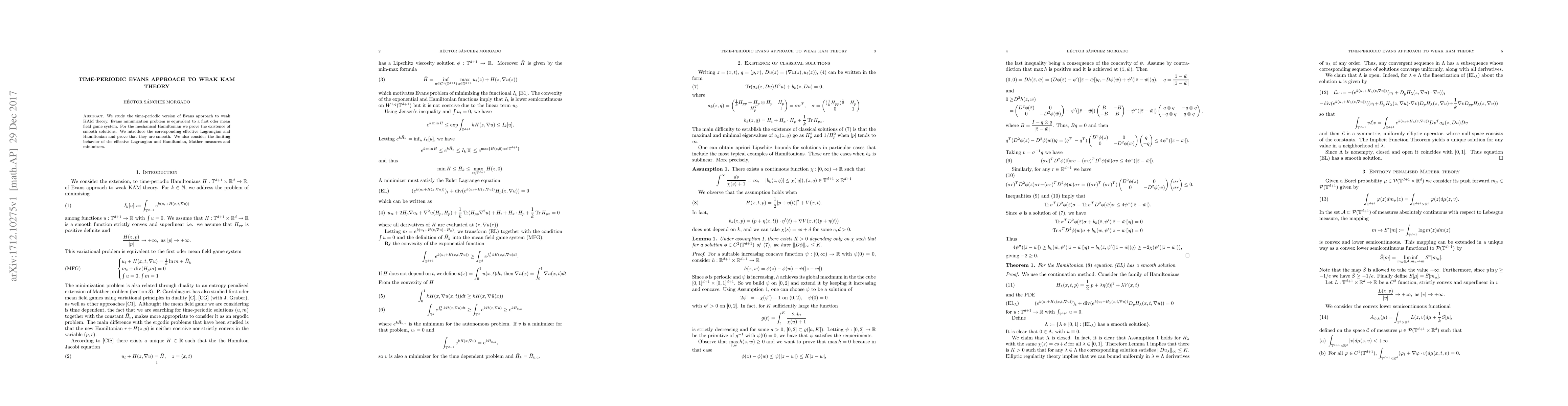 We study the time-periodic version of Evans approach to weak KAM theory. Evans minimization problem is equivalent to a first oder mean field game system. For the mechanical Hamiltonian we prove the existence of smooth solutions. We introduce the corresponding effective Lagrangian and Hamiltonian and prove that they are smooth. We also consider the limiting behavior of the effective Lagrangian and Hamiltonian, Mather measures and minimizers.