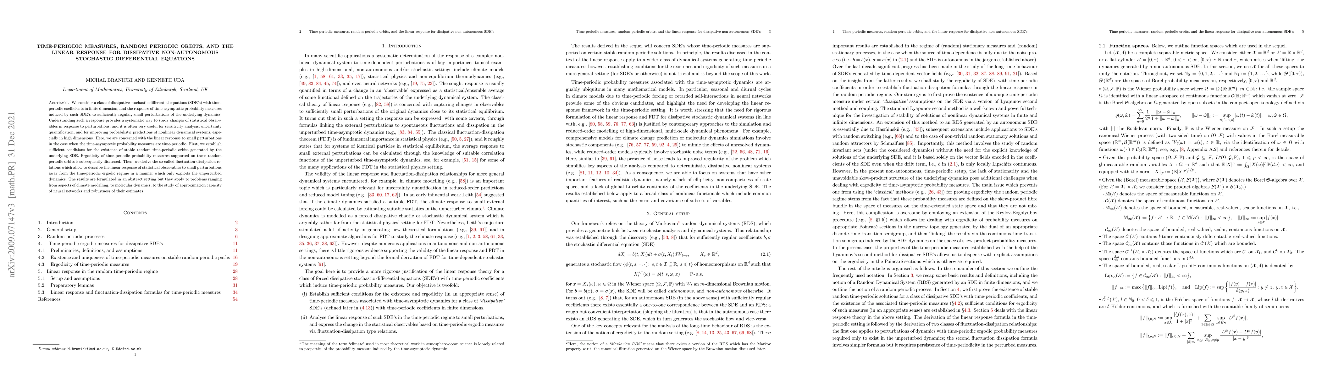 This paper investigates dissipative stochastic differential equations with time-periodic coefficients, focusing on the linear response of time-asymptotic probability measures to small perturbations. It establishes conditions for stable random time-periodic orbits and derives fluctuation-dissipation relations for linear response, applicable to various fields including climate modeling and neural networks.