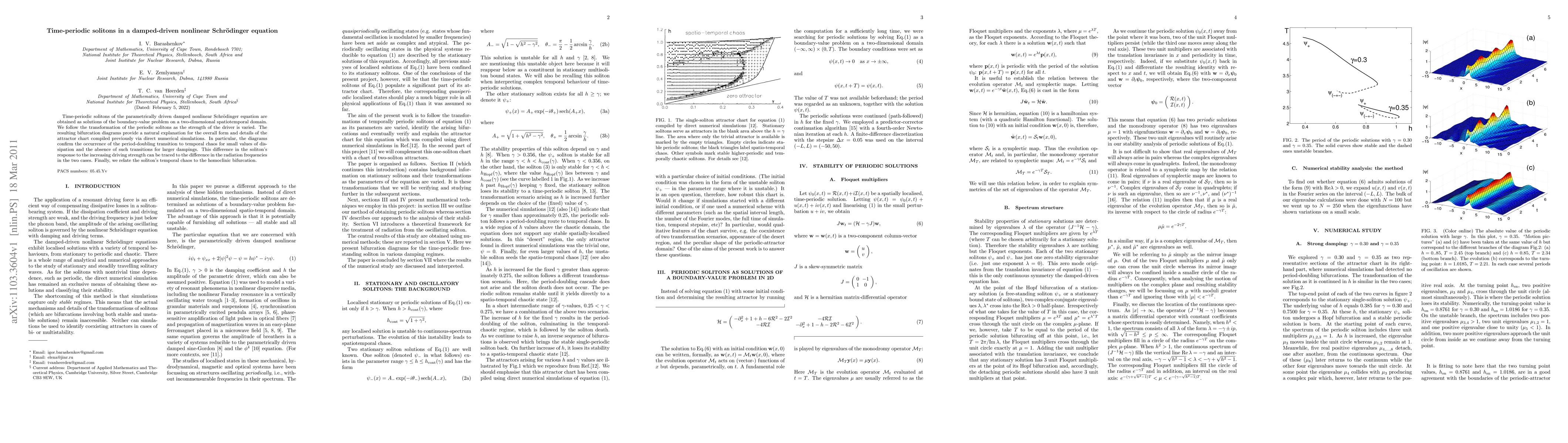 Time-periodic solitons of the parametrically driven damped nonlinear Schr\"odinger equation are obtained as solutions of the boundary-value problem on a two-dimensional spatiotemporal domain. We follow the transformation of the periodic solitons as the strength of the driver is varied. The resulting bifurcation diagrams provide a natural explanation for the overall form and details of the attractor chart compiled previously via direct numerical simulations. In particular, the diagrams confirm the occurrence of the period-doubling transition to temporal chaos for small values of dissipation and the absence of such transitions for larger dampings. This difference in the soliton's response to the increasing driving strength can be traced to the difference in the radiation frequencies in the two cases. Finally, we relate the soliton's temporal chaos to the homoclinic bifurcation.