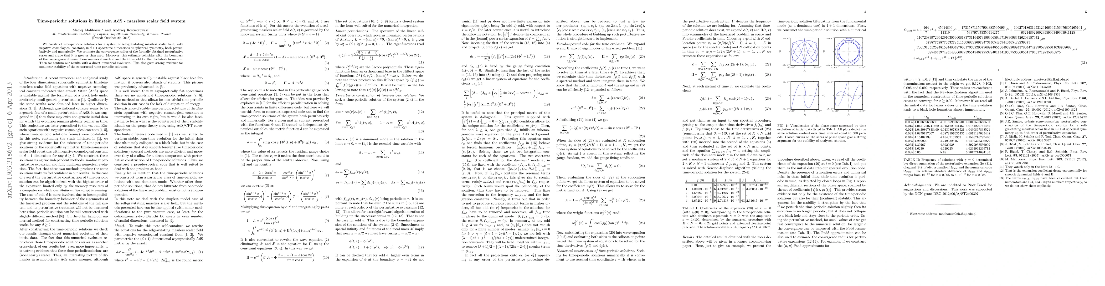 We construct time-periodic solutions for a system of self-gravitating massless scalar field, with negative cosmological constant, in d+1 spacetime dimensions at spherical symmetry, both perturbatively and numerically. We estimate the convergence radius of the formally obtained perturbative series and argue that it is greater then zero. Moreover, this estimate coincides with the boundary of the convergence domain of our numerical method and the threshold for the black-hole formation. Then we confirm our results with a direct numerical evolution. This also gives strong evidence for nonlinear stability of the constructed time-periodic solutions.