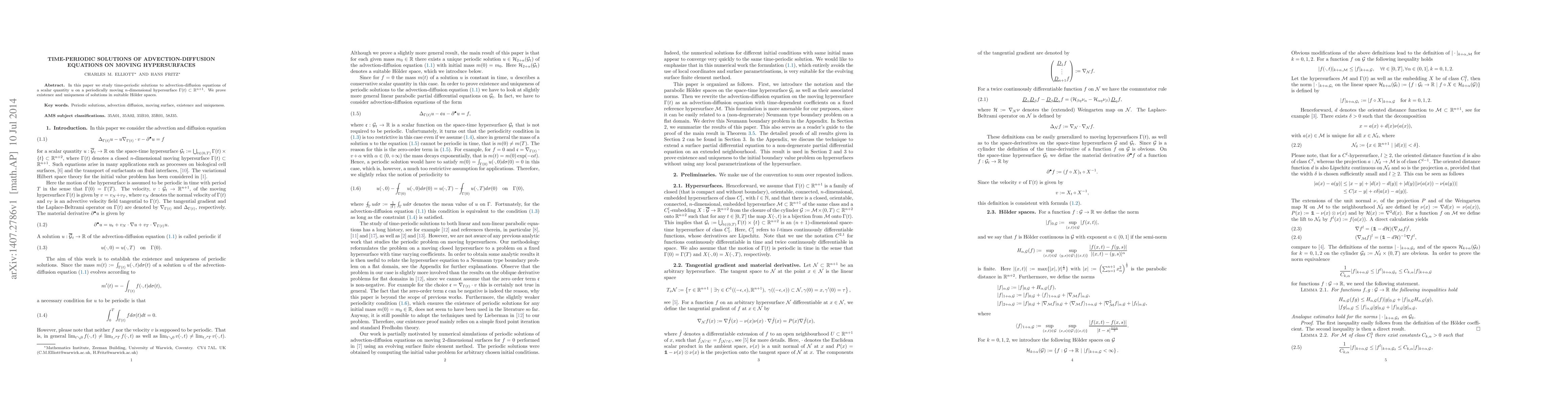This paper investigates time-periodic solutions for advection-diffusion equations of a scalar quantity on a periodically moving hypersurface, proving their existence and uniqueness within specific H\"older spaces.