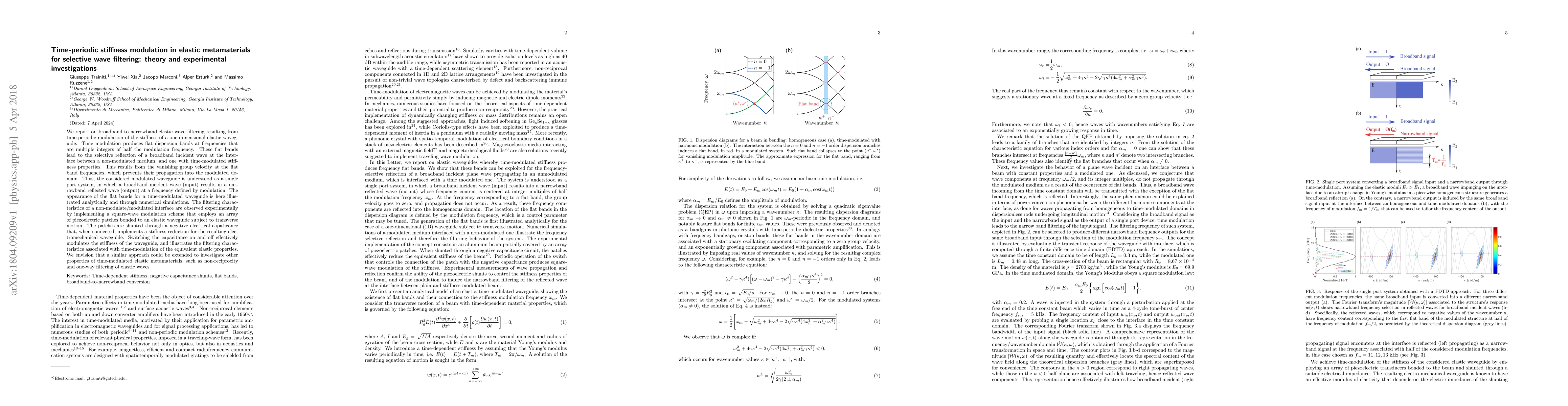 This paper explores the selective filtering of elastic waves using time-periodic stiffness modulation in elastic metamaterials. Theoretical and experimental results demonstrate that modulating stiffness creates flat dispersion bands, leading to selective reflection of broadband waves at specific frequencies.
