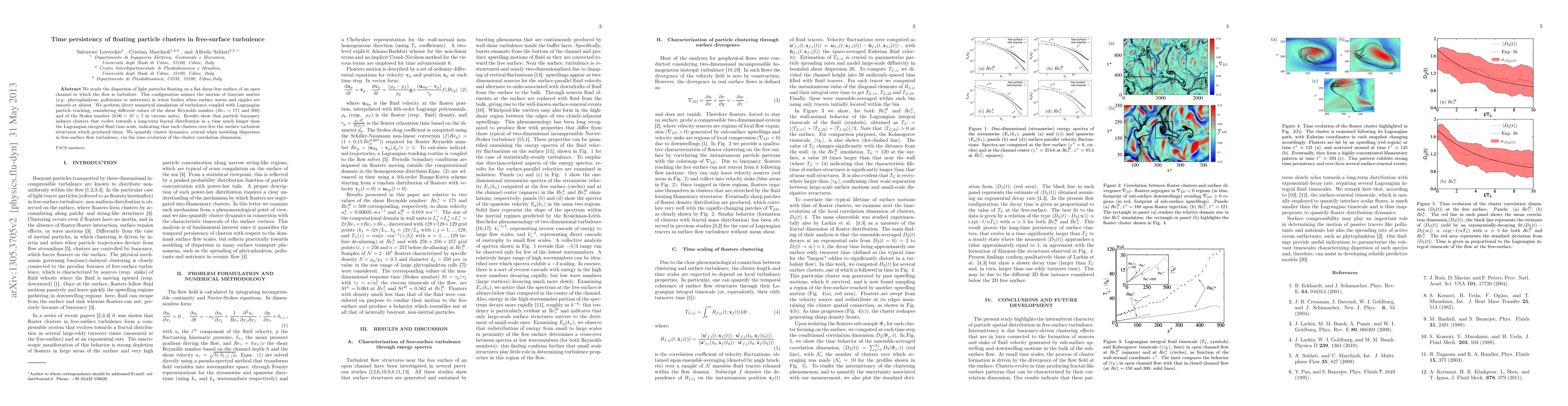 This study investigates the dispersion and clustering of buoyant particles in turbulent free-surface flow using direct numerical simulations. The findings reveal that particle clusters persist longer than the turbulent fluid structures, evolving into a fractal distribution over time, which is important for modeling dispersion in such environments.