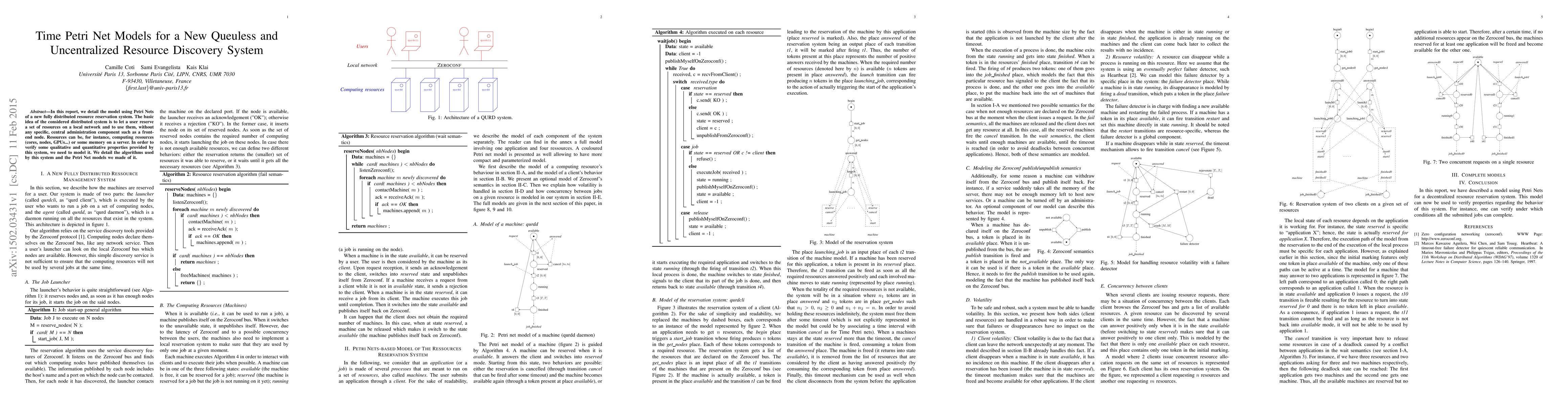 In this report, we detail the model using Petri Nets of a new fully distributed resource reservation system. The basic idea of the considered distributed system is to let a user reserve a set of resources on a local network and to use them, without any specific, central administration component such as a front-end node. Resources can be, for instance, computing resources (cores, nodes, GPUs...) or some memory on a server. In order to verify some qualitative and quantitative properties provided by this system, we need to model it. We detail the algorithms used by this system and the Petri Net models we made of it.