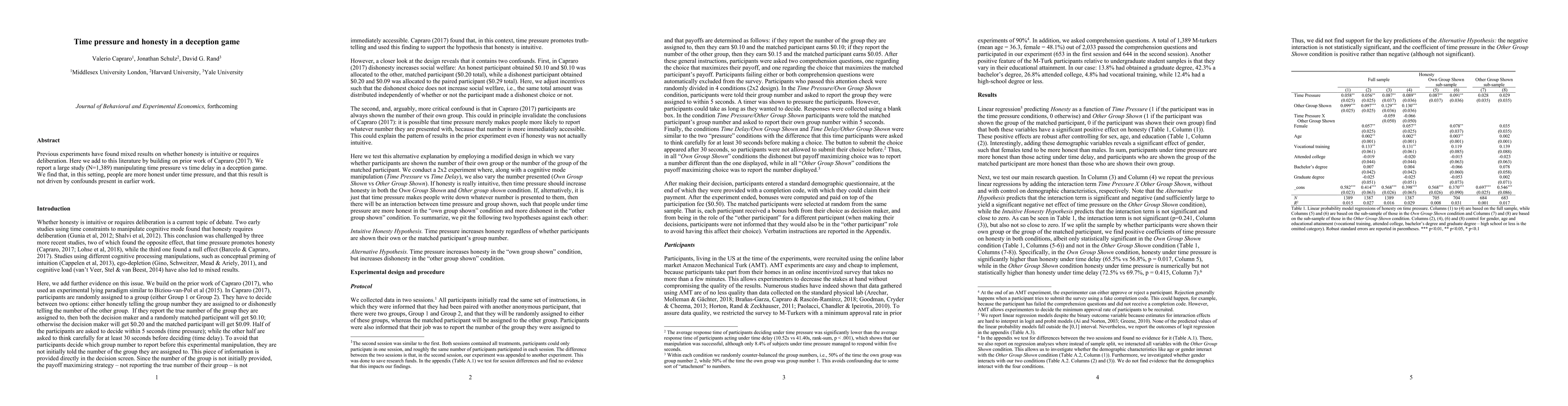 A large study found that people are more honest in a deception game when under time pressure, contradicting earlier mixed results. This result suggests that honesty is not always intuitive and can be influenced by external factors.