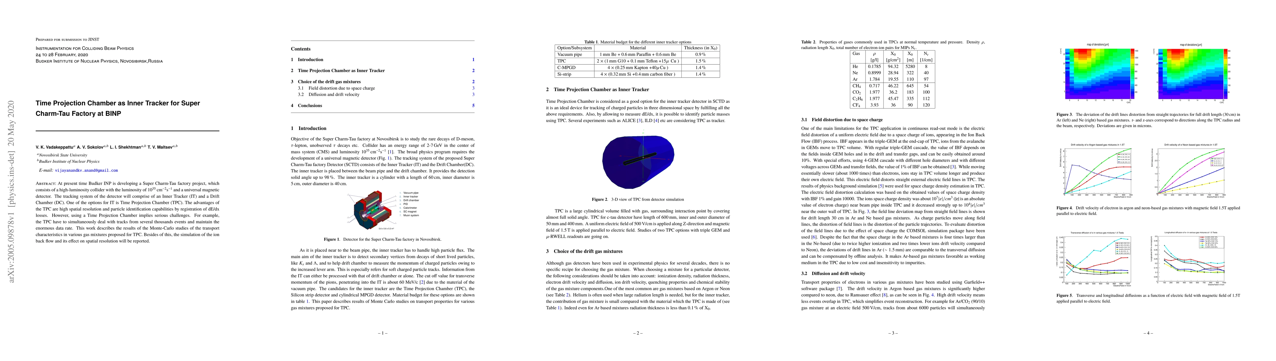 At present time Budker INP is developing a Super Charm-Tau factory project, which consists of a high-luminosity collider with the luminosity of $10^{35}$,cm$^{-2}$s$^{-1}$ and a universal magnetic detector. The tracking system of the detector will comprise of an Inner Tracker (IT) and a Drift Chamber (DC). One of the options for IT is Time Projection Chamber (TPC). The advantages of the TPC are high spatial resolution and particle identification capabilities by registration of dE/dx losses. However, using a Time Projection Chamber implies serious challenges. For example, the TPC have to simultaneously deal with tracks from several thousands events and maintain the enormous data rate. This work describes the results of the Monte-Carlo studies of the transport characteristics in various gas mixtures proposed for TPC. Besides of this, the simulation of the ion back flow and its effect on spatial resolution will be reported.