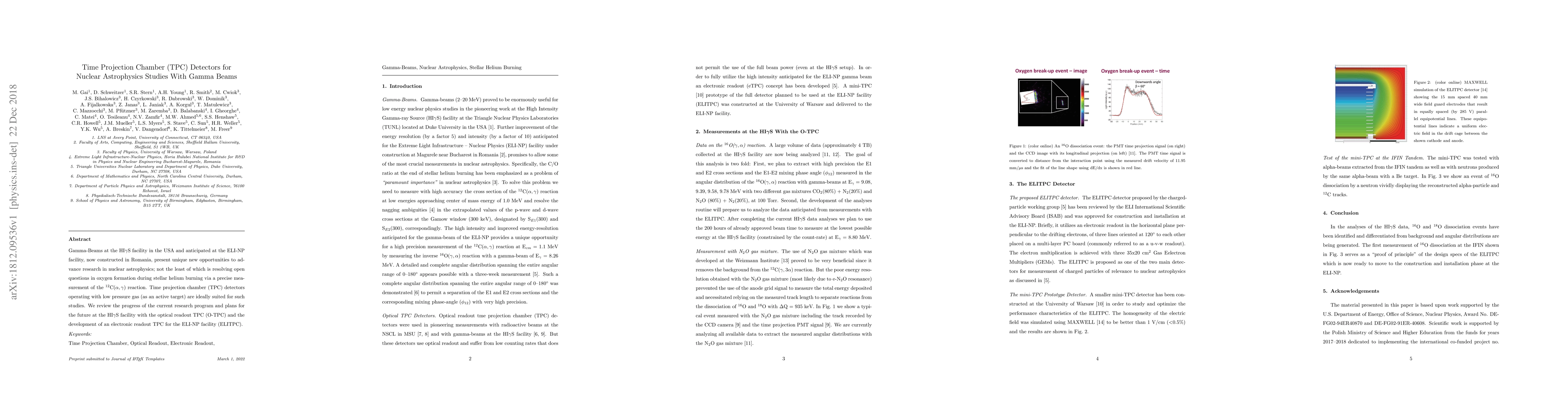 This paper reviews the application of Time Projection Chamber (TPC) detectors, particularly optical and electronic readout TPCs, to study nuclear astrophysics using gamma beams at HIγS and ELI-NP facilities. It focuses on resolving questions about oxygen formation in stellar helium burning through precise measurements of the 12C(α,γ) reaction.