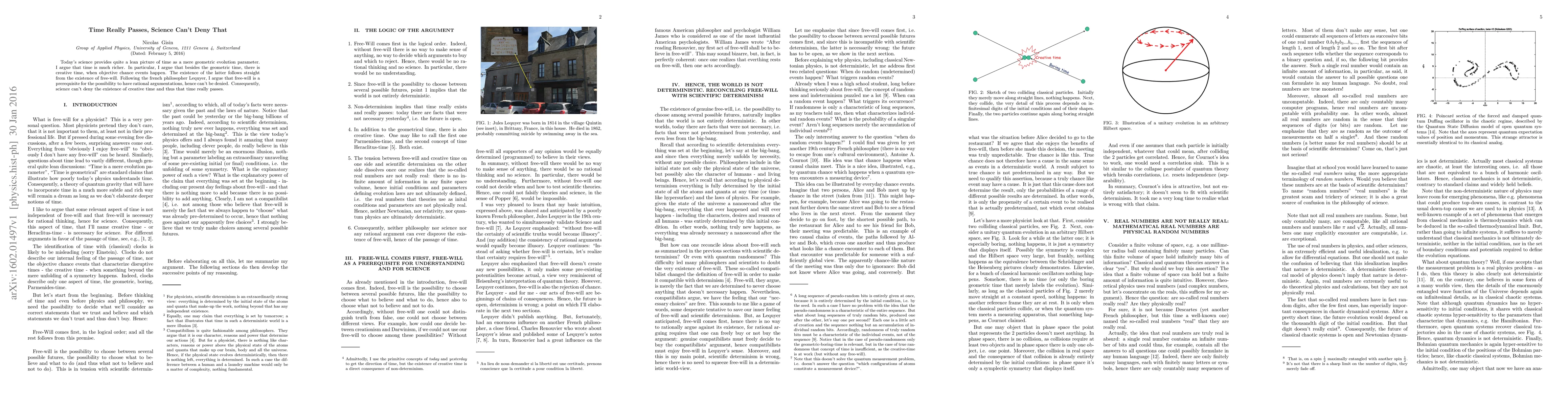 Today's science provides quite a lean picture of time as a mere geometric evolution parameter. I argue that time is much richer. In particular, I argue that besides the geometric time, there is creative time, when objective chance events happen. The existence of the latter follows straight from the existence of free-will. Following the french philosopher Lequyer, I argue that free-will is a prerequisite for the possibility to have rational argumentations, hence can't be denied. Consequently, science can't deny the existence of creative time and thus that time really passes.