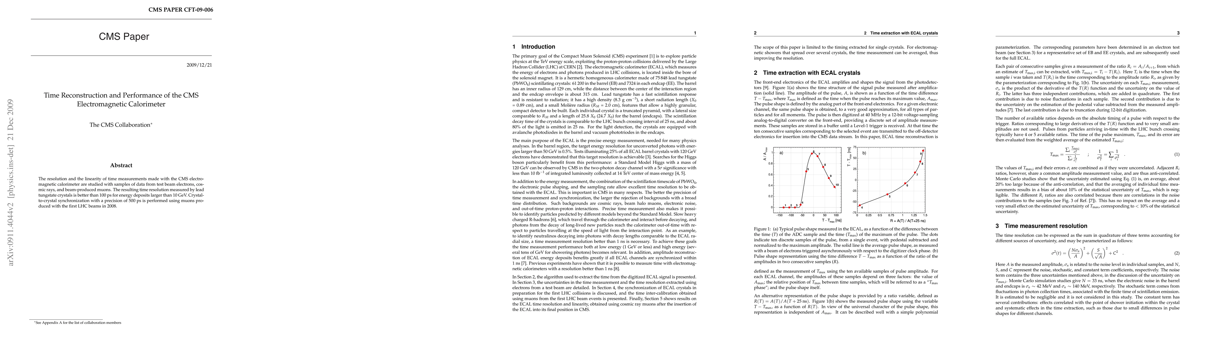 The CMS electromagnetic calorimeter demonstrates time resolution better than 100 ps for energy deposits over 10 GeV, and achieves crystal-to-crystal synchronization precision of 500 ps using cosmic rays and beam-produced muons.