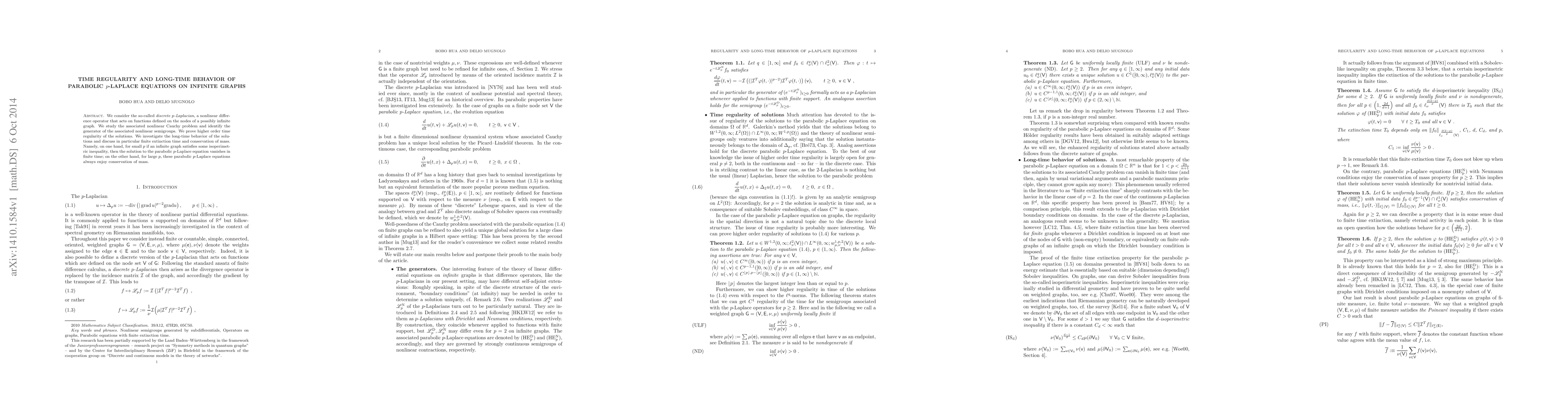 We consider the so-called \emph{discrete $p$-Laplacian}, a nonlinear difference operator that acts on functions defined on the nodes of a possibly infinite graph. We study the associated nonlinear Cauchy problem and identify the generator of the associated nonlinear semigroups. We prove higher order time regularity of the solutions. We investigate the long-time behavior of the solutions and discuss in particular finite extinction time and conservation of mass. Namely, on one hand, for small $p$ if an infinite graph satisfies some isoperimetric inequality, then the solution to the parabolic $p$-Laplace equation vanishes in finite time; on the other hand, for large $p,$ these parabolic $p$-Laplace equations always enjoy conservation of mass.