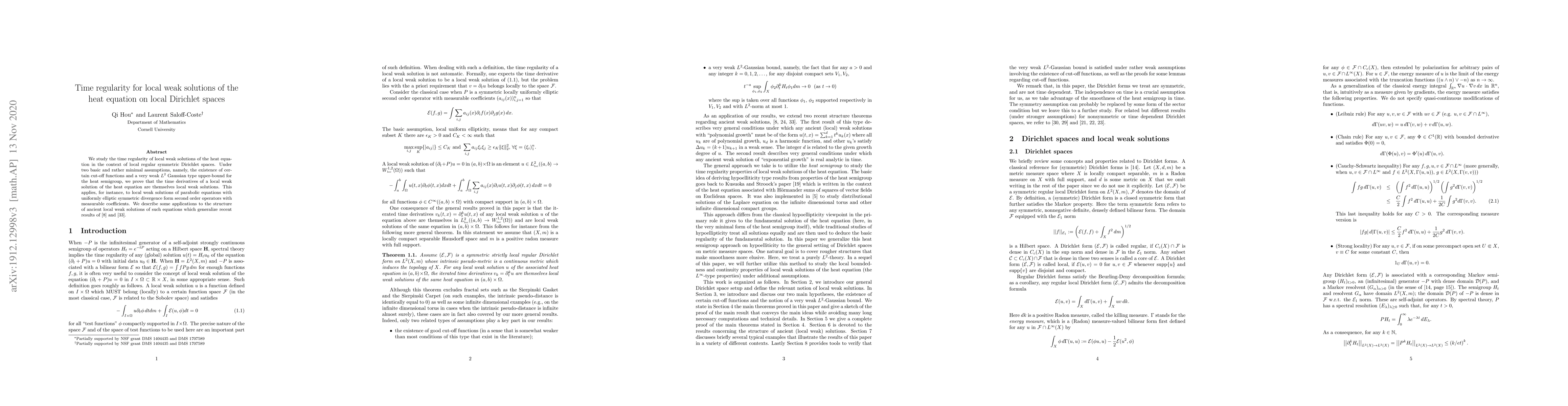 The paper investigates the time regularity of local weak solutions to the heat equation in local regular symmetric Dirichlet spaces, proving that their time derivatives are also local weak solutions under minimal assumptions. Applications include insights into the structure of ancient local weak solutions, extending recent findings.