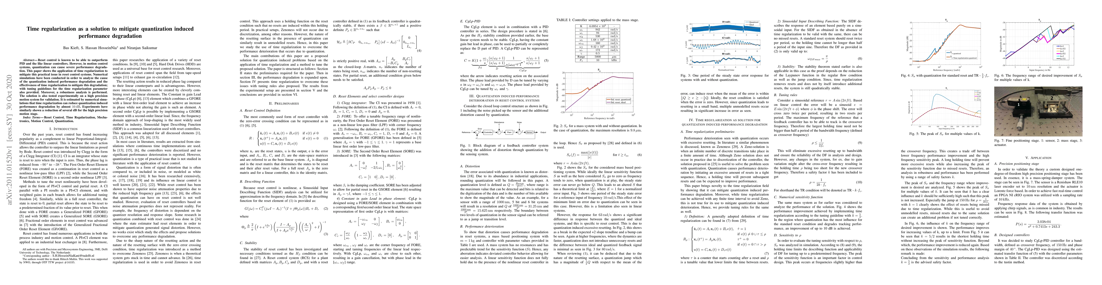 This paper proposes time regularization to mitigate quantization-induced performance degradation in reset control systems, demonstrating its effectiveness through numerical simulations and experimental validation on a high precision motion system. The study provides tuning guidelines and shows a reduction of nearly 10 dB in performance degradation.
