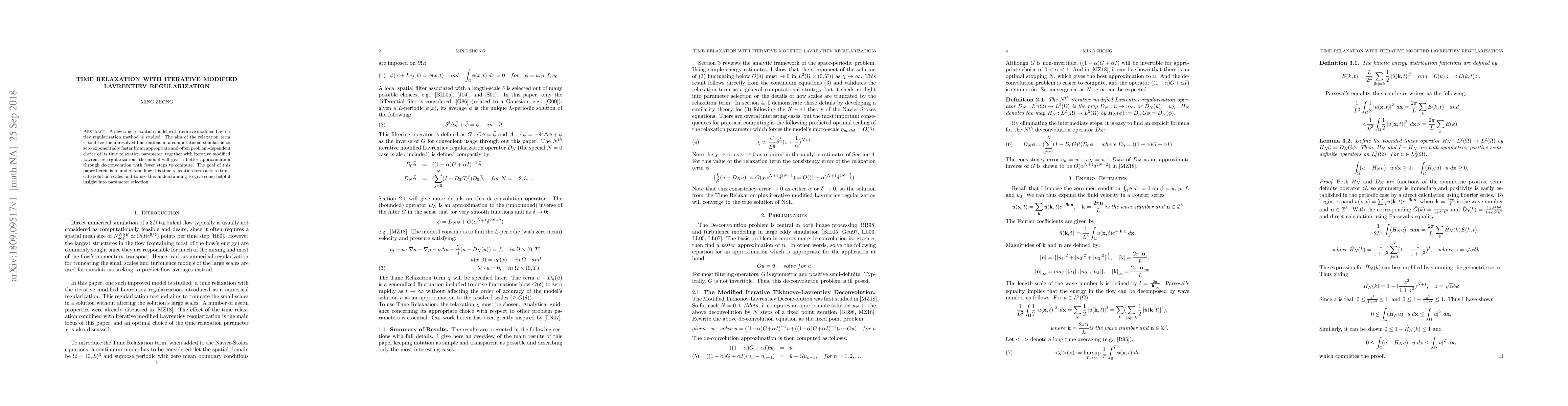 A new time relaxation model with iterative modified Lavrentiev regularization method is studied. The aim of the relaxation term is to drive the unresolved fluctuations in a computational simulation to zero exponentially faster by an appropriate and often problem-dependent choice of its time relaxation parameter; together with iterative modified Lavrentiev regularization, the model will give a better approximation through de-convolution with fewer steps to compute. The goal of this paper herein is to understand how this time relaxation term acts to truncate solution scales and to use this understanding to give some helpful insight into parameter selection.
