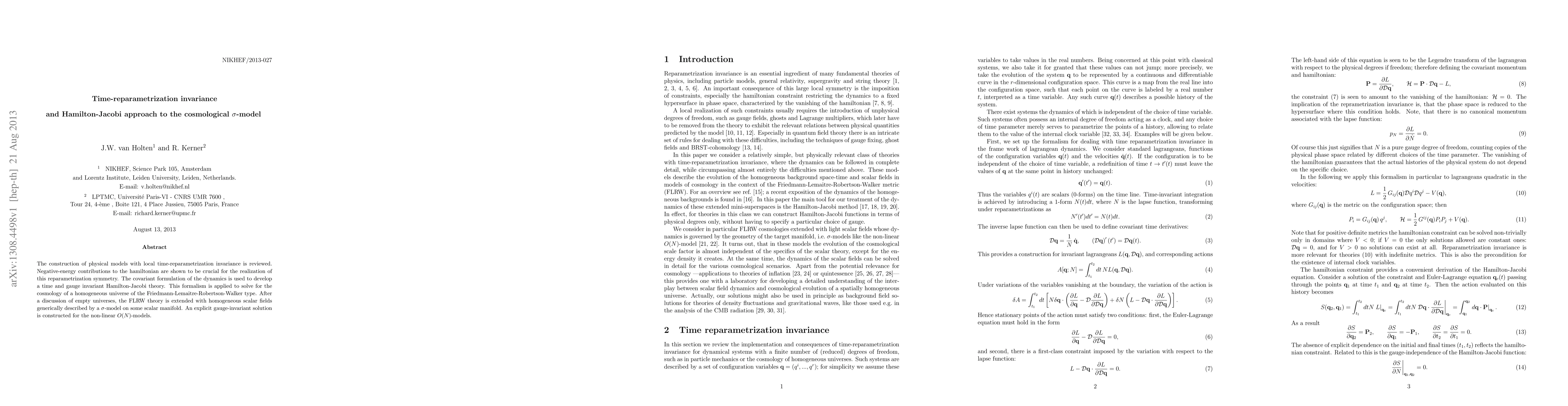 The construction of physical models with local time-reparametrization invariance is reviewed. Negative-energy contributions to the hamiltonian are shown to be crucial for the realization of this reparametrization symmetry. The covariant formulation of the dynamics is used to develop a time and gauge invariant Hamilton-Jacobi theory. This formalism is applied to solve for the cosmology of a homogeneous universe of the Friedmann-Lemaitre-Robertson-Walker type. After a discussion of empty universes, the FLRW theory is extended with homogeneous scalar fields generically described by a $\sg$-model on some scalar manifold. An explicit gauge-invariant solution is constructed for the non-linear O(N)-models.