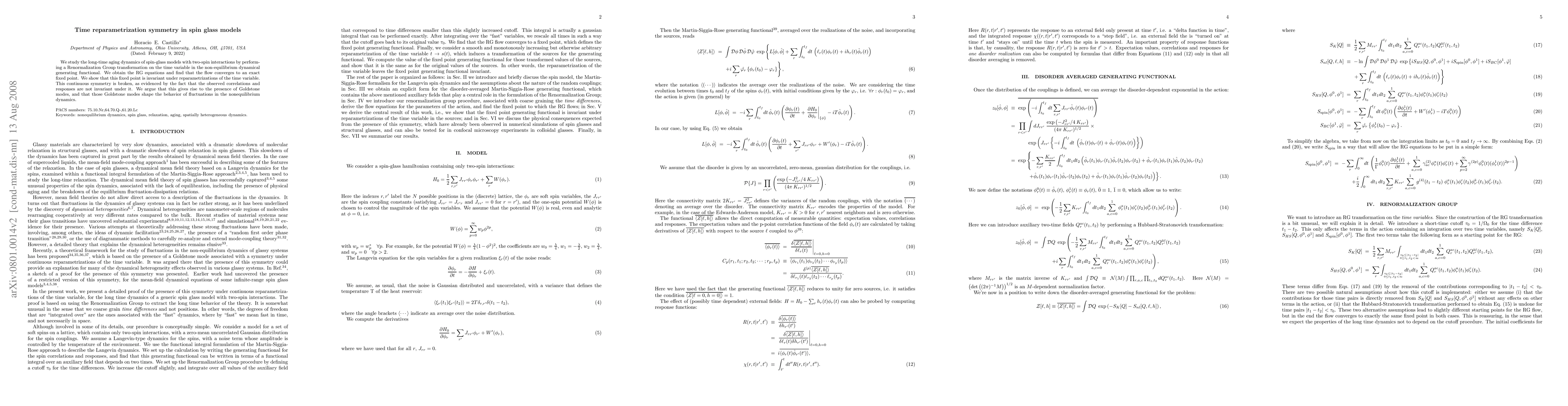 We study the long-time aging dynamics of spin-glass models with two-spin interactions by performing a Renormalization Group transformation on the time variable in the non-equilibrium dynamical generating functional. We obtain the RG equations and find that the flow converges to an exact fixed point. We show that this fixed point is invariant under reparametrizations of the time variable. This continuous symmetry is broken, as evidenced by the fact that the observed correlations and responses are not invariant under it. We argue that this gives rise to the presence of Goldstone modes, and that those Goldstone modes shape the behavior of fluctuations in the nonequilibrium dynamics.