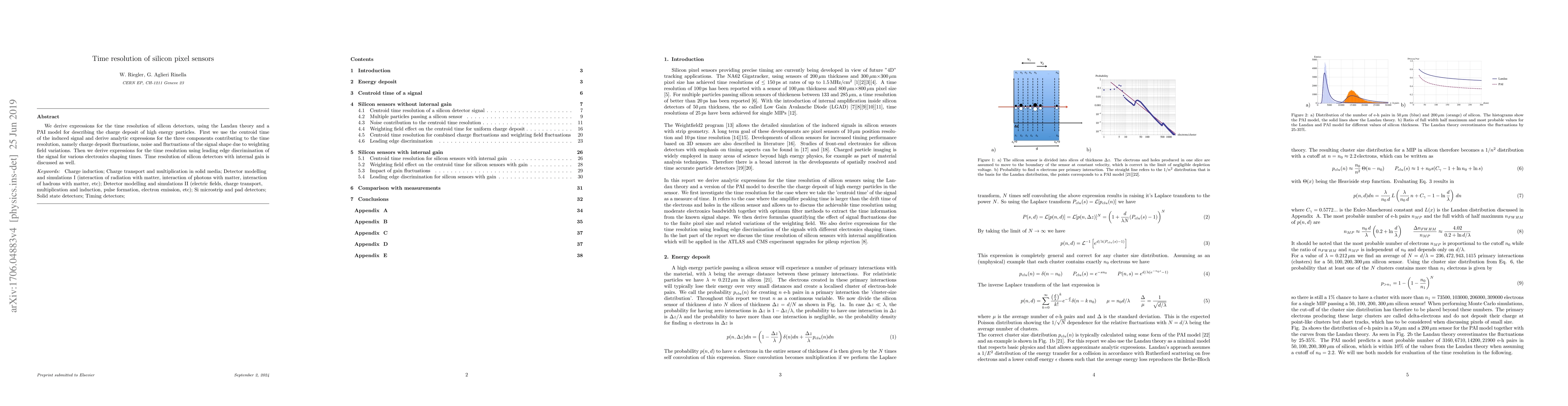 This paper derives expressions for the time resolution of silicon pixel sensors using Landau theory and PAI models, accounting for charge deposit fluctuations, noise, and signal shape variations.