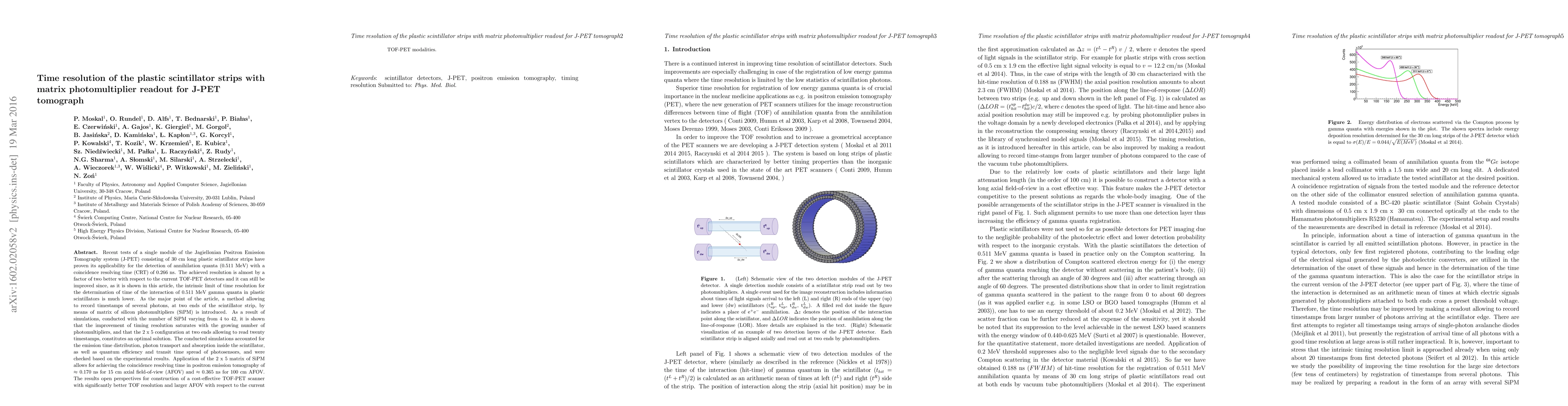 This paper investigates the time resolution of plastic scintillator strips in the J-PET tomograph, achieving a coincidence resolving time of 0.266 ns, nearly double the resolution of current TOF-PET detectors. The study introduces a matrix of silicon photomultipliers (SiPM) for timestamp recording, demonstrating that a 2x5 SiPM configuration optimizes timing resolution, leading to a CRT of approximately 0.170 ns for a 15 cm axial field-of-view.